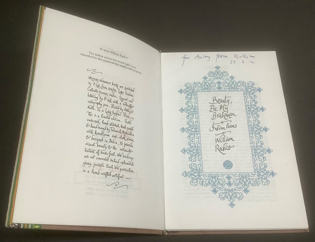 Limited Edition 8vo. clothbound hardback, gilt, with decorative woven outer edge and decorative title to upper board. 139pp. plus 4pp. about the Writers Workshop at end. Inscibed in pen by author "For Antony from William 23.3.12" on title page. No other markings or inscriptions. A VERY GOOD COPY.