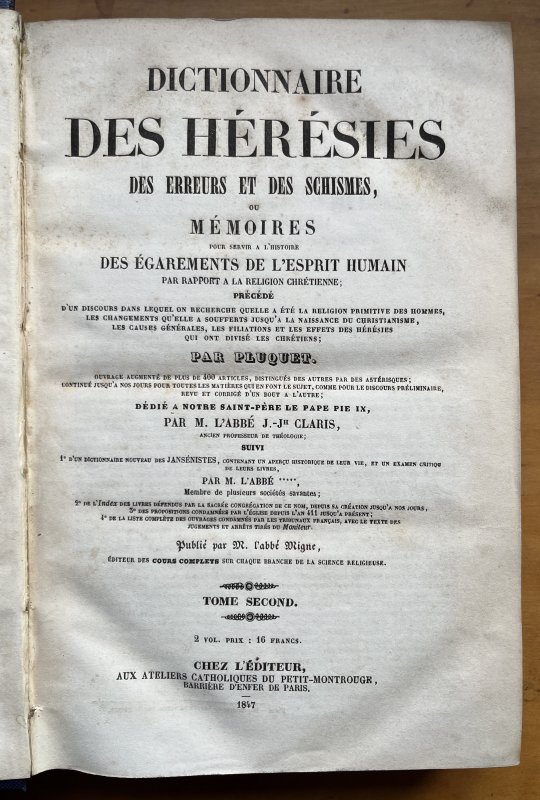 DICTIONNAIRE DES HERESIES DES ERREURS ET DES SCHISMES, Ou Memoires Pour Servir a L'Histoire Des Egarements de L'Esprit Humain par Rapport a la Religion Chretienne; (2 Volumes)