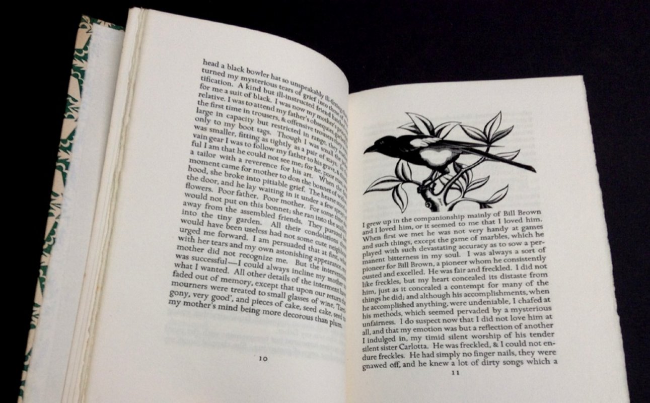 FIRST, LIMITED EDITION, Number 359 of 1000 copies. Small 4to. quarter bound in green morocco, gilt, with patterned paperbound boards (designed by Tirzah Garwood). t.e.g. Binding by Sangorski & Sutcliffe, London. 58pp., with b/w engravings by Robert Gibbings. With loose Notice to Subscribers. A clean copy with no previous owners' markings or inscriptions. Slight fading to spine and wear at top and base. Boards lightly soiled. Overall a VERY GOOD COPY.