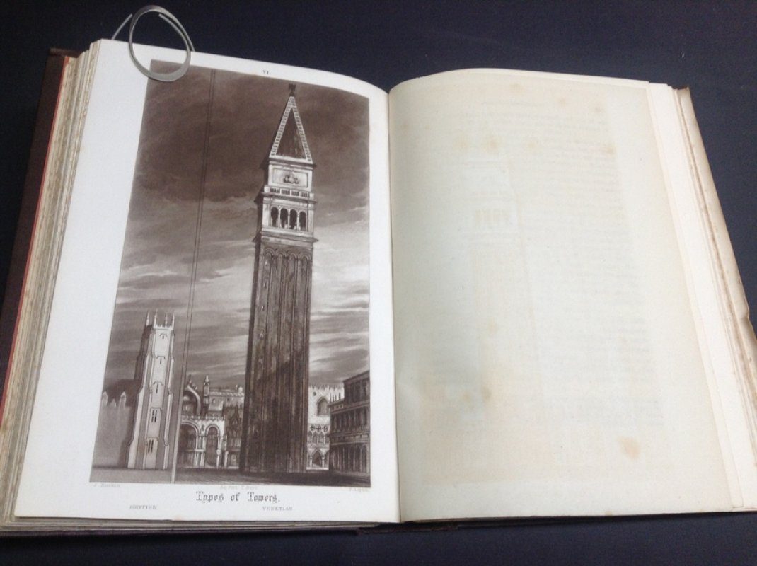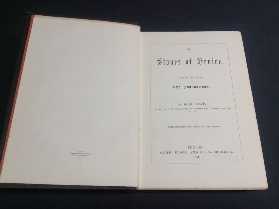 FIRST EDITIONS, FIRST IMPRESSIONS 3 Volumes. Royal 8vo. (approx. 27 x 19cm), uniformly bound in publisher's decorative brown cloth with gilt titles to spines, gilt decorations to all boards, and blind-embossed decoration all over. t.e.g. Volume I: 413pp. plus 2pp. Publisher's Prospectus for Examples of the Architecture of Venice and Volume II of The Stones of Venice at rear. Errata slip following List of Plates. Illustrated with 21 tissue-guarded plates (3 hand-coloured, 7 Sepia and 11 b/w) plus 72 figs. within the text. Volume II: 393pp. plus Publisher's 16pp. catalogue, dated September 1853, at rear. Illustrated with 20 tissue-guarded plates (2 hand-coloured and 18 b/w) plus 38 figs. within the text. Volume III: 362pp. plus Publisher's 16pp. catalogue, dated October 1853, at rear. Illustrated with 12 tissue-guarded plates (11 b/w and 1 blue monochrome) plus 4 figs. and 4 Gallery plans within the text. All volumes have the armorial bookplate of James Milnes Stansfield to front pastedown and his signature to ffep (also to top of title page of Vol. III). All volumes have occasional light foxing, mainly to foredges and plates of Vols. II and III. Vol. I has split hinge between main text and Publisher's prospectus, resulting in last few pages a little proud. Otherwise bindings nice and firm. First plate in Vol. III partly detached. Light wear to tops and bases of spines and corners otherwise a VERY GOOD SET.