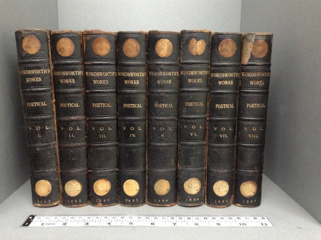 Eight vols, 8vo., [not including later 3 vol. Life of Wordsworth]. Ex. Sion College Library with neat library stamps on reverse of title pages. Bound in black publishers cloth. Several vols have either their front or rear board detached, but held on by inner hinge tape reinforcement. Other inner hinges are slack but holding. Boards are rubbed at edges and spine ends, some are wrinkled. All vols have protective mylar covers. A good, sound working set. PLEASE ENQUIRE FOR DETAILED DESCRIPTION.