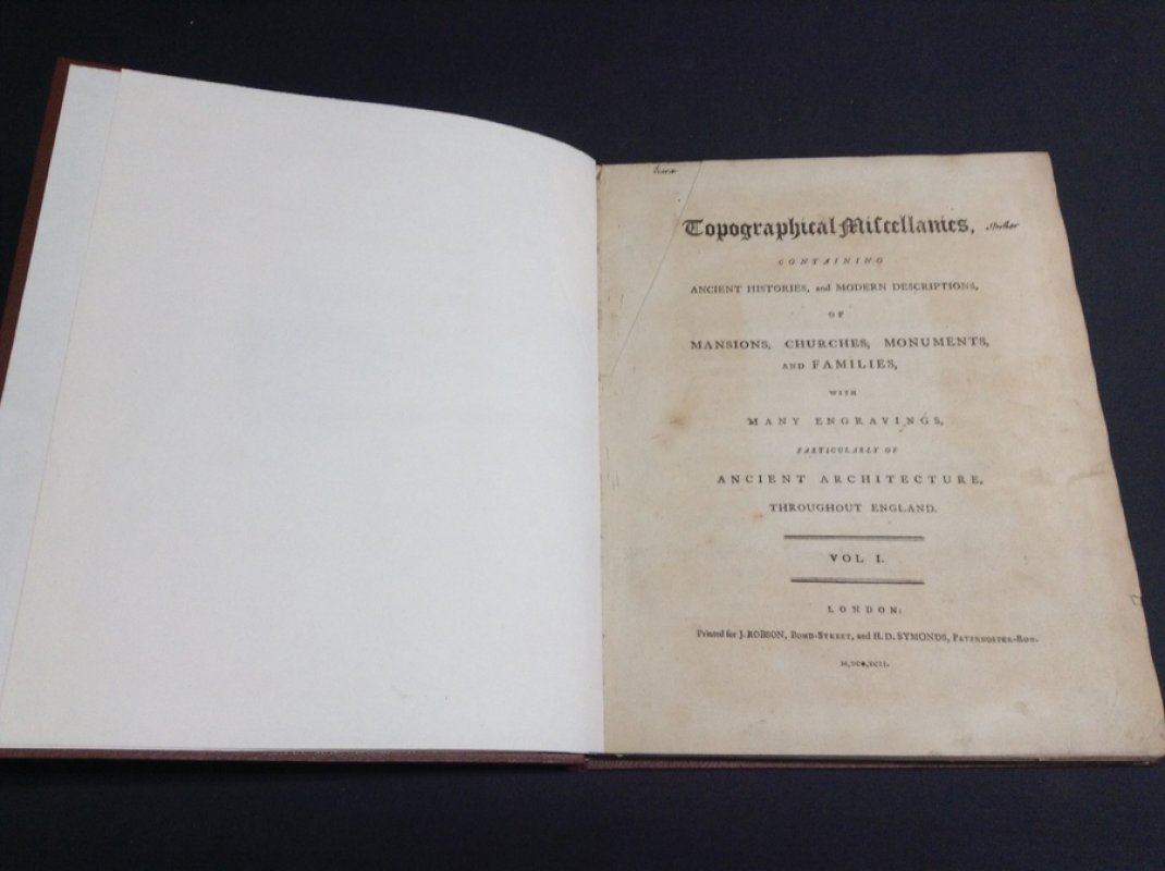 TOPOGRAPHICAL MISCELLANIES containing Ancient Histories, and Modern Descriptions, of Mansions, Churches, Monuments, and Families, with many Engravings, particularly of Ancient Architecture, throughout England. Volume I [only volume published]