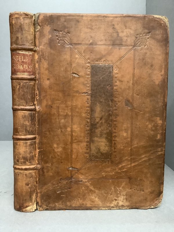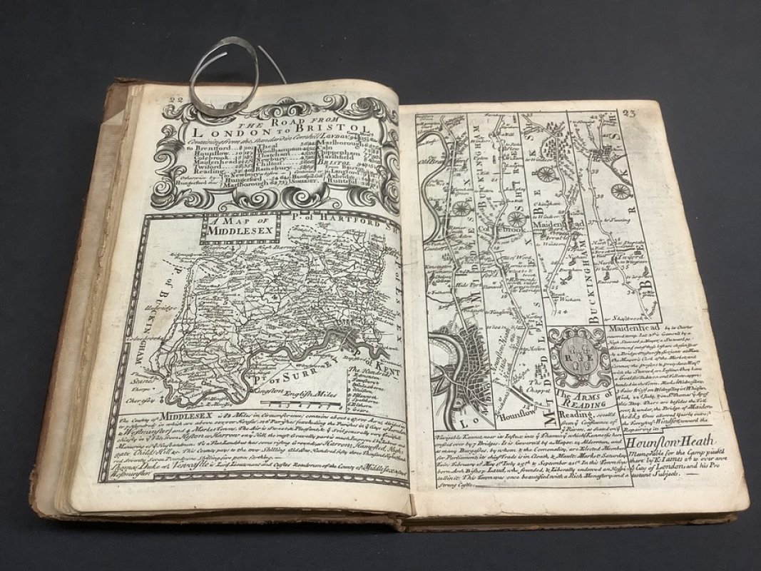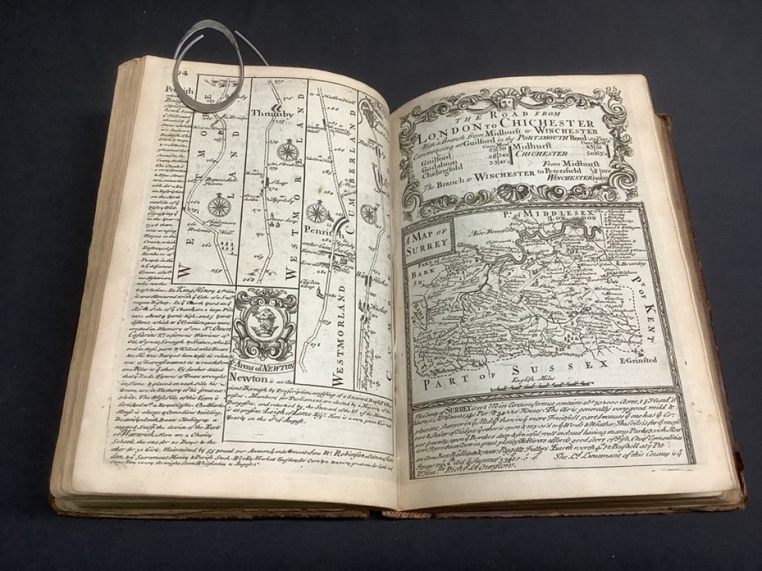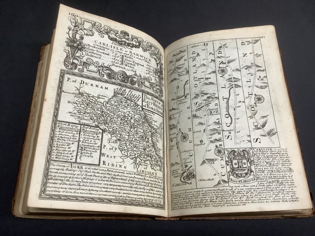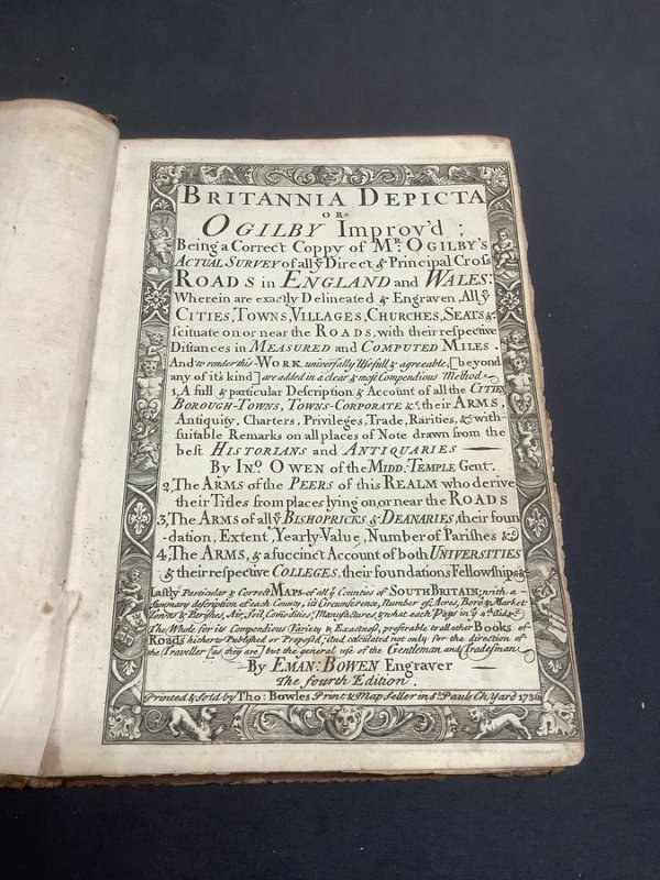 Fourth Edition Small 4to. (approx. 20.5 x 13.5cm) hardback in full 18th century calf with raised bands, dark red title label, gilt to spine and blind-embossed decorative borders to boards. Title page, 8pp. Table or Index of the Cities and Market Towns, 273pp. Maps and Coats of Arms (Strip road maps and 54 County maps). Ink name and date (1778) to verso of title page. Light foxing to prelims. First gather of Map section and ffep partially detached. Small hole to ffep. Horizontal crease across lower fifth of upper board with matching split to front pastedown (please see photos). Boards and spine somewhat rubbed and worn. Overall a GOOD+ copy internally in Sound but shabby covers. (A possible candidate for a rebind).