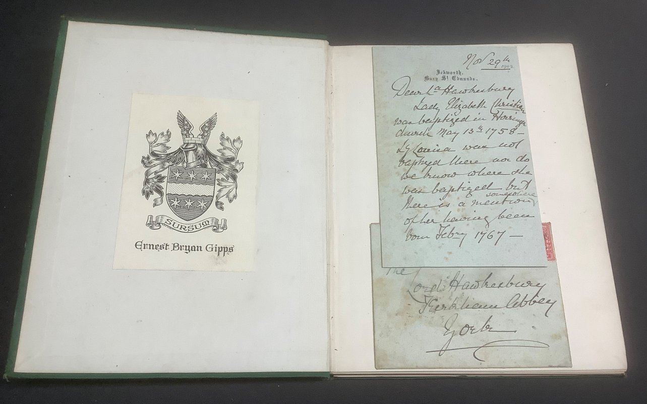 FIRST EDITION Small 4to. dark green cloth hardback, gilt. 109pp., illustrated in b/w. Modern bookplate to front pastedown and 1902 illegible letter (headed Ickworth, Bury St. Edmunds and addressed to Lord Hawkesbury) and envelope pasted to ffep. Pencil notes at end of Preface. One gather slightly loose. Gilt to spine slightly dulled. Overall a Good+ Copy.