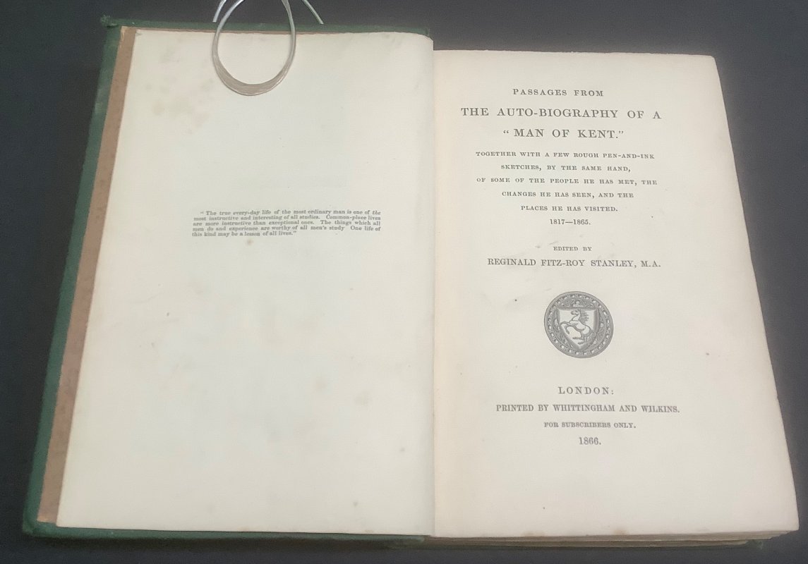 PASSAGES FROM THE AUTO-BIOGRAPHY OF A "MAN OF KENT" Together with a few Rough Pen-and-Ink Sketches, by the Same Hand, of some of the People he has met, the Changes he has Seen, and the Places he has Visited. 1817-1865