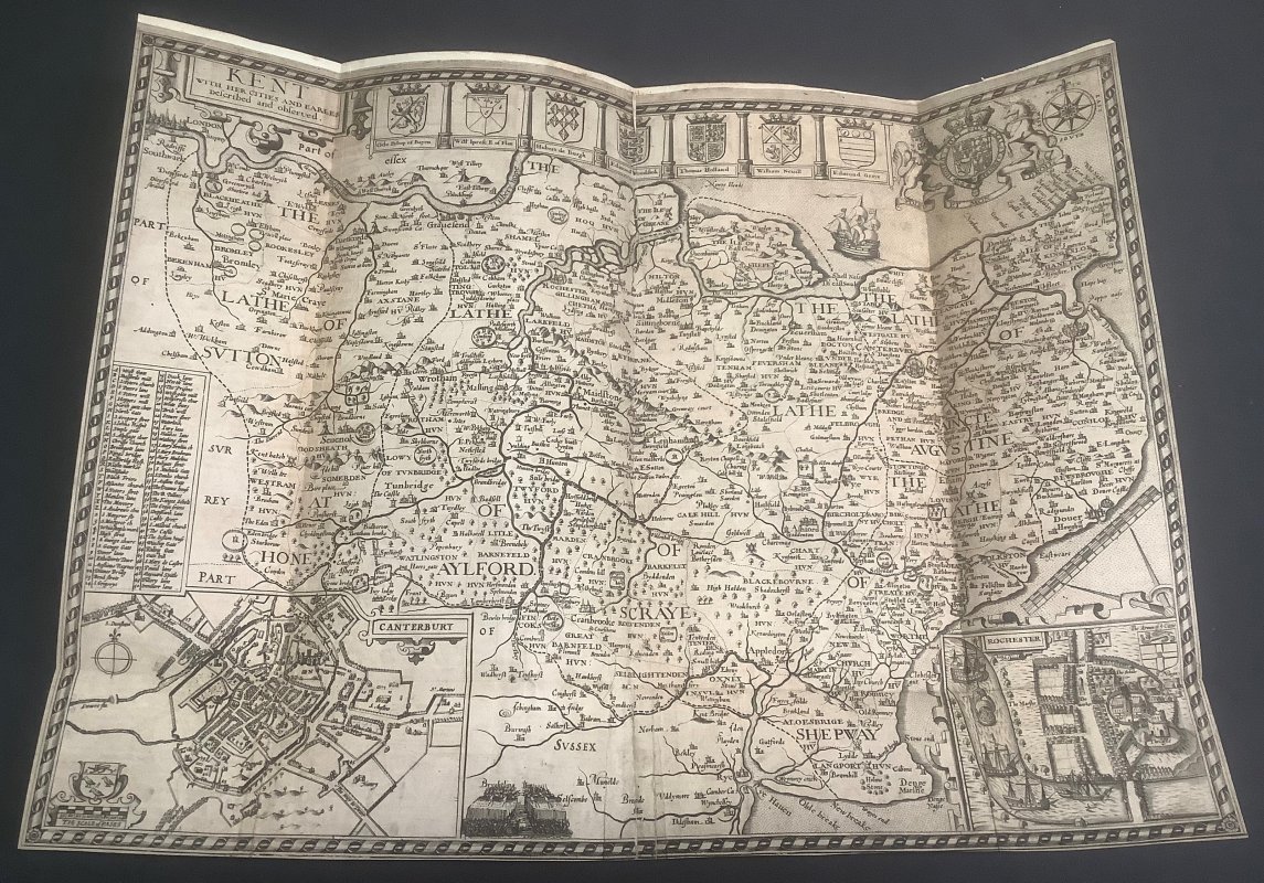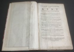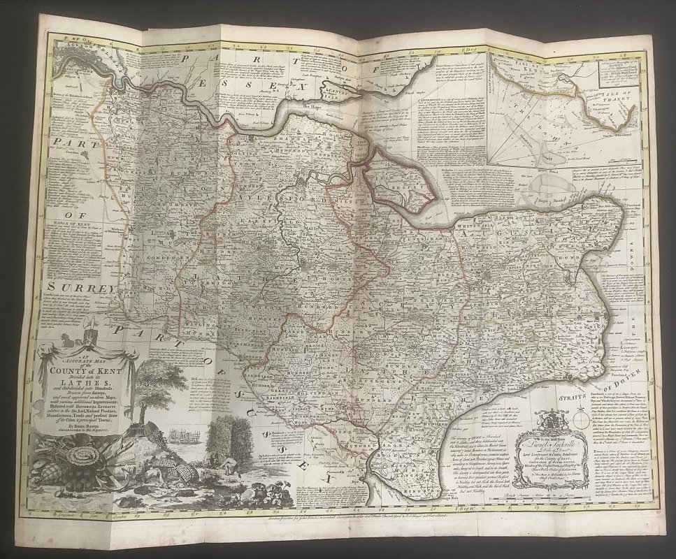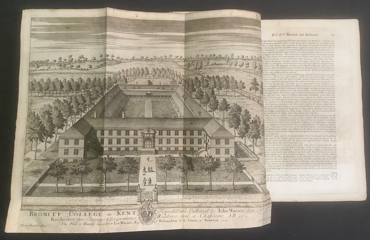 SECOND EDITION, CORRECTED 4to. (approx. 34 x 20.5cm) hardback rebound in modern cdark brown morocco, 2 red title laberl, gilt, to spine and marbled boards. t.e.g. New endpapers. [4], iv, 400pp. plus 11pp. Index and 1p. Advertisement at end. Illustrated with a large hand-coloured folding Map of Kent "An Accurate Map of the County of Kent Divided into its Lathes, 1751" by Eman. Bowen, a rebacked Map of Kent "Kent with her Cities and Earles Described and Observed" nd c.1611 by John Speed. Plus a large folding plate of Bromley College by John Harris, dated 1720, and 2 figures on 1 plate and 1 hand-coloured vignette within text. Elegant ink signature to early blank and small bookplate to rear pastedown. Occasional pencil noted in margins. Some light foxing, occasionally heavier, particularly to untrimmed foredge. A VERY GOOD COPY.