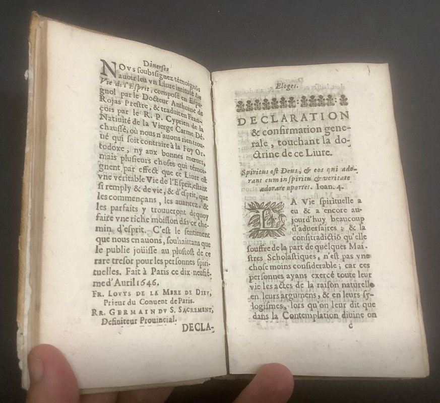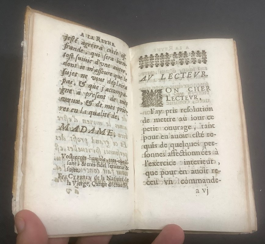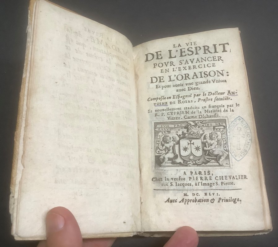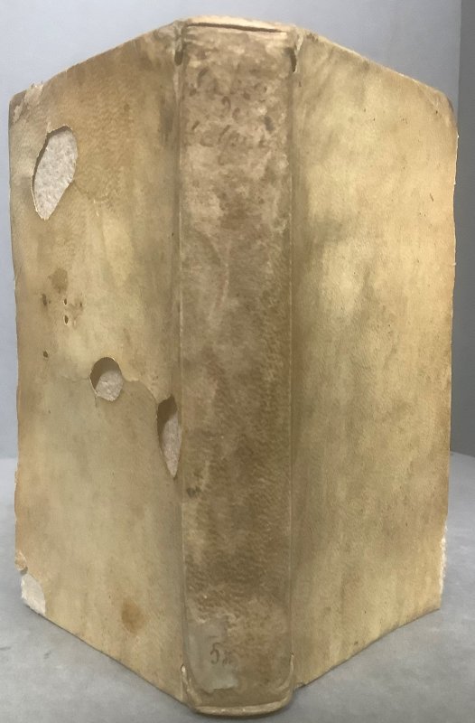 12mo., in full old vellum with old faint hand-lettering to spine; TEXT IN FRENCH; title + [49pp] + 5pp Table des Chapitres + 237pp + 2pp 'Extrait du Privilege du Roy'. Old blue rubber stamps to title page, foot of last page plus occasionally throughout, small mark to foredge, old pencil annotation to prelims and ink underlining to title page, vellum rather soiled and damaged, with several small holes to lower cover. Sound overall.