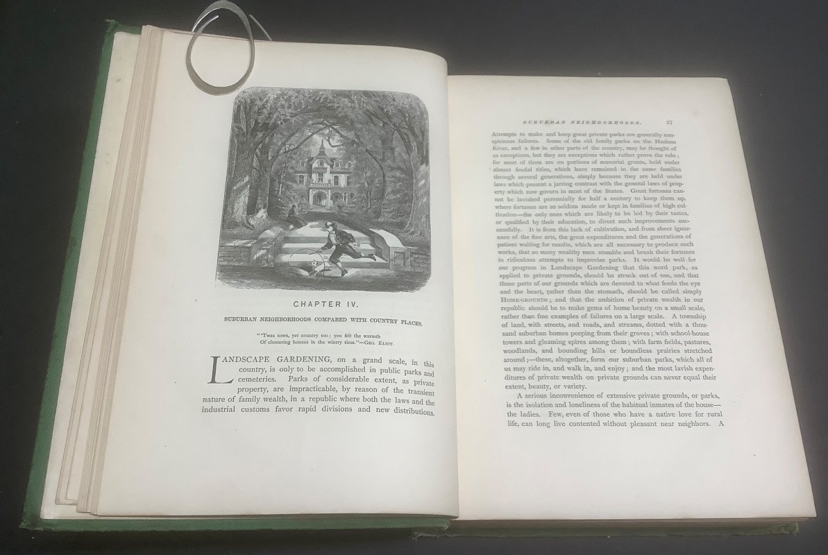 FIRST EDITION 8vo. green pebbled cloth hardback with decorative gilt to spine and boards. 618pp., Indexed, plus 6pp. Publisher's Advertisements at end. Illustrated with over 200 plates and engravings of Plans for Residences and their Grounds, of Trees and Shrubs, and Garden Embellishment'. A clean copy with no previous owners' markings or inscriptions. Occasional light foxing, heavier to prelims and foredge. Small area of staining to bottom edge of front endpapers. Boards rather soiled and edge worn with light fraying to spine edges, top and base (please see photos). Overall a Good Copy.