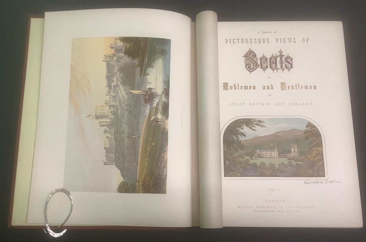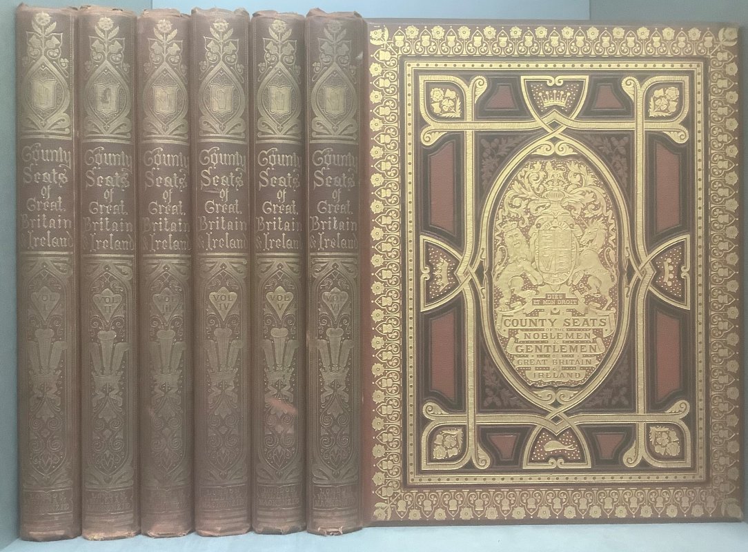 6 Volumes, Complete 4to. brown decorated cloth hardbacks, highly ornate gilt spines and gilt and black upper boards with bevelled edges. a.e.g. Each volume has a tissue-guarded colour frontipiece and a colour vignette to title page plus 38 tissue-guarded colour plates, one for each residence listed. Pencil name and notes to ffep of Volume I and pencil name to ffep of Volume VI. Ink caption