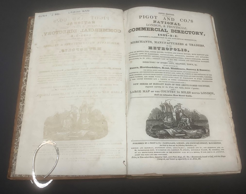 PIGOT AND CO.'S NATIONAL LONDON, & PROVINCIAL COMMERCIAL DIRECTORY FOR 1832-3-4 + PIGOT AND CO'S NATIONAL COMMERCIAL DIRECTORY 1830 (2 Volumes) Volume I: Comprising a Classification of, and Alphabetical Reference to Merchants, Manufacturers & Traders of the Metropolis. Also a Directory of every City, Seaport, Town, &c. in the counties of Essex, Hertfordshire, Kent, Middlesex, Surrey & Sussex. Vo