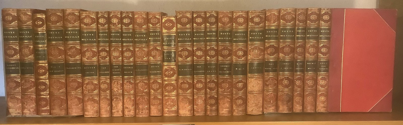 Mostly "New Edition", a few volumes with no Edition stated. 23 Volumes containing 24 novels uniformly bound in half red calf with raised bands, two dark green title labels and decorative gilt, with red cloth boards. All edges speckled in red. Engraved armorial bookplate to each ffep. Occasional light foxing, mainly to prelims. Some light wear and rubbing to spines, especially bases. Occasional light spots of soiling to boards and damp staining to top outer corner of one volume. Overall a GOOD+, HANDSOME SET.