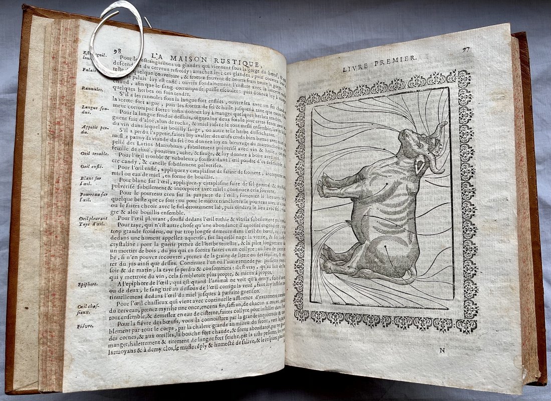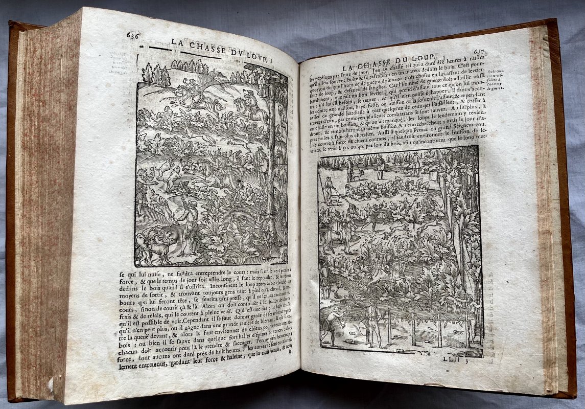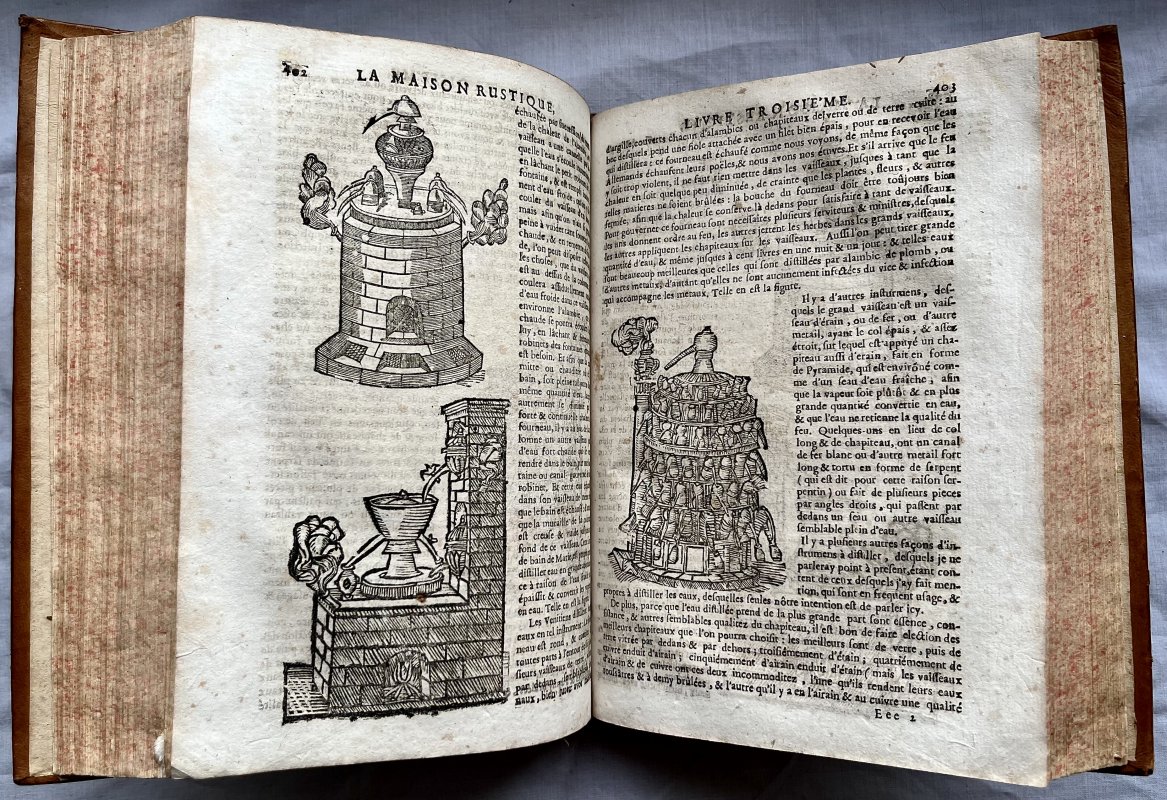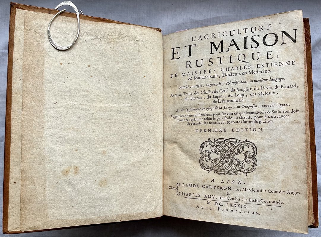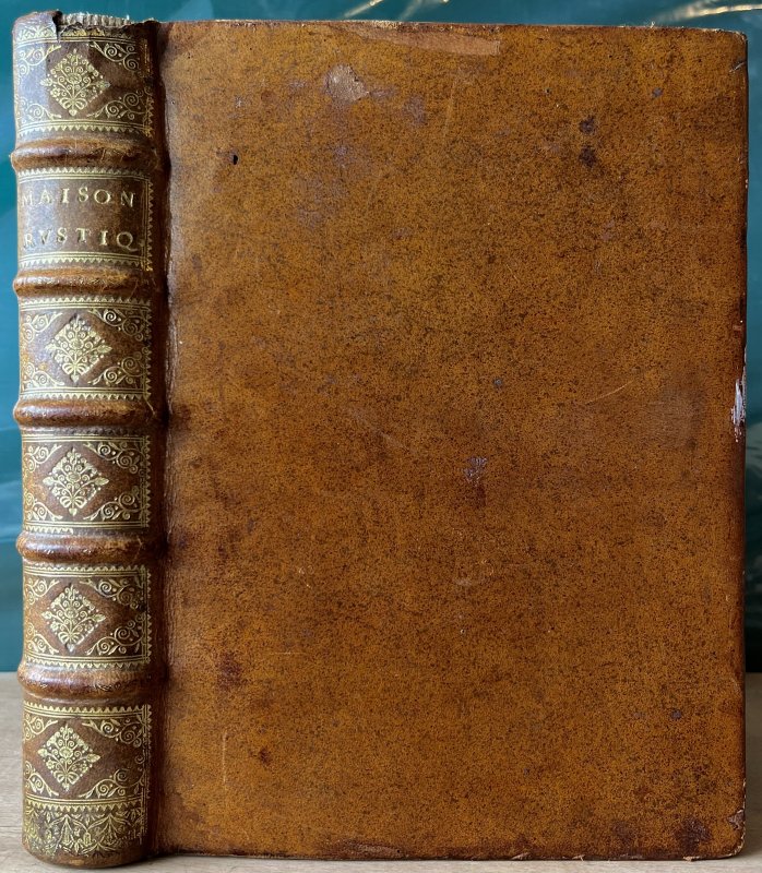 Derniere Edition (Revue, corrigee, augmentee, et mise dans un meilleur langage). [Latest Edition, Reviewed, corrected, increased, and put into better language] 4to. (approx. 24 x 17cm) in full contemporary calf with raised bands and decorative gilt to spine. All edges speckled in scarlet. Title, [2] Au Lecteur, [4] Instruction, 659pp. Text (last 4 pages mis-numbered but correct otherwise), [19] Table [Index], [1] Permissions. TEXT IN FRENCH. Text divided into 7 Livres plus La Chasse du Loup by Jean Clarmotgan which was added to editions from 1570, and a small section on L'Usage de la Jauge ou Diapason [The Use of the Guage or Tuning Fork]. Book I illustrated with 2 large woodcuts. Book II with 1 large and 1 small woodcut and 20 Plans of garden layouts. Book III with 4 small and 6 large woodcuts. Book V with 3 large woodcuts. The Chasse de la Loup with 14 large woodcuts and the Tuning Fork section with 12 diagrams. A clean copy with no previous owners' markings or inscriptions. Some light foxing and offsetting, occasionally heavier. A few lower edges of leaves opened clumsily. Small hole to top of p.345 and small area of loss and small hole (old worming) to lower outer corner of p.467 with slight loss of text. Small area of loss to top of spine (please see photos) and a few minor scuffs to boards. Small mark of white paint to outer edge of upper board. A VERY GOOD COPY