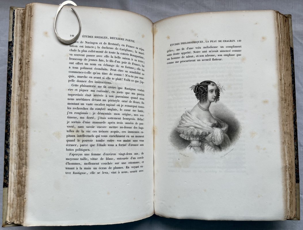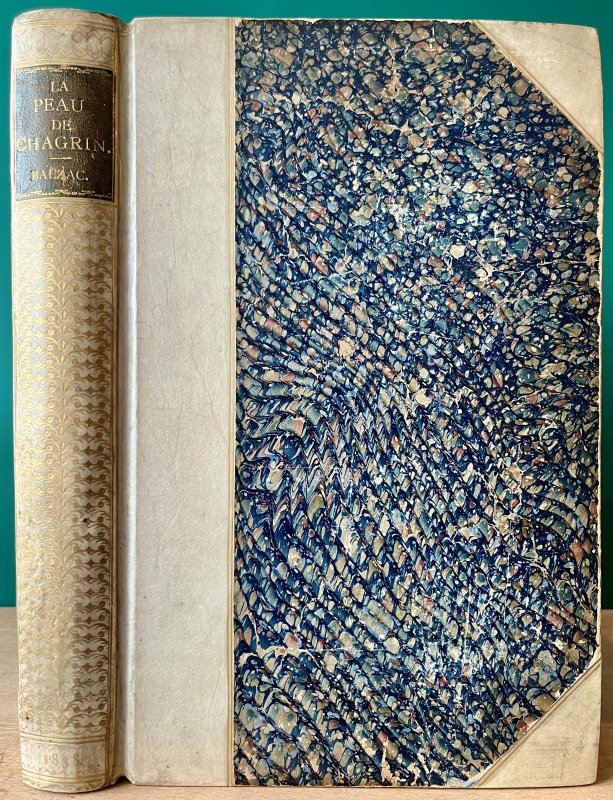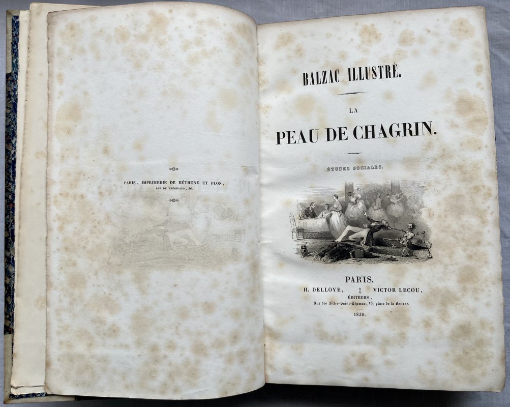 FIRST ILLUSTRATED EDITION Royal 8vo. half vellum with marbled boards. Green leather title label to very ornate gilt decorated spine. t.e.g. Marbled endpapers. TEXT IN FRENCH. 402pp., with original illustrated paper wraps from a later edition (dated 1841) bound-in at rear. Title with vignette showing a man being pulled backward by skeleton, armed with a scythe, plus 100 steel engraved vignettes in the text after drawings by Adam, Baron, Boulanger, Charlet, David, Dev