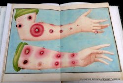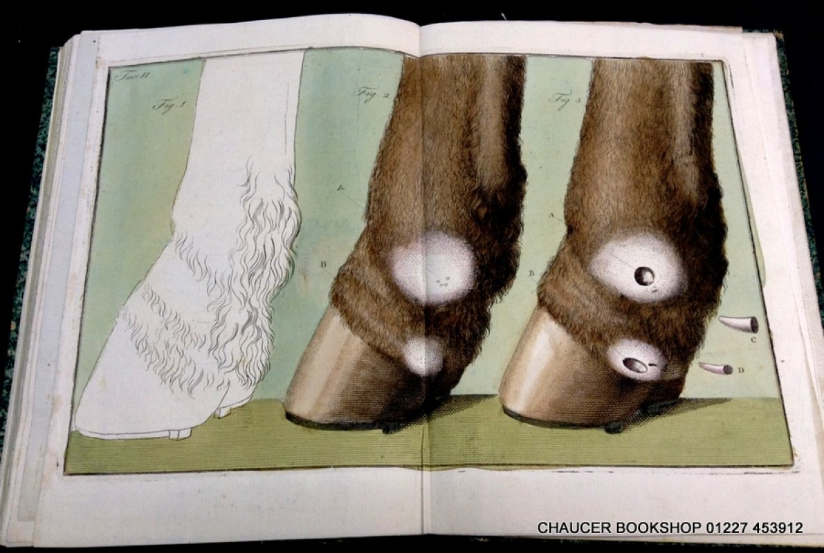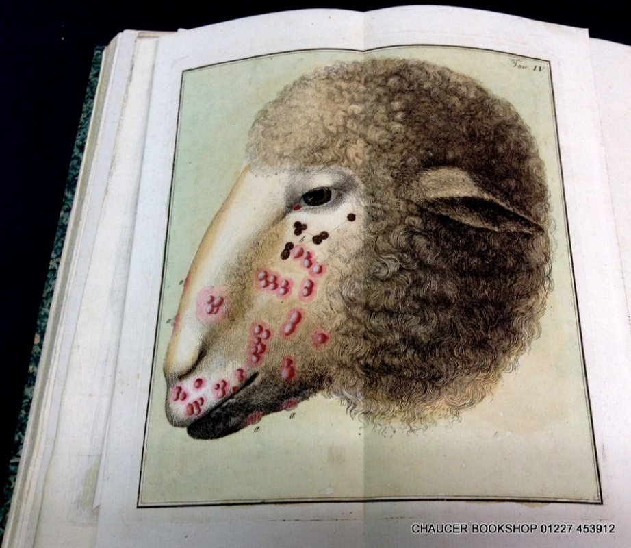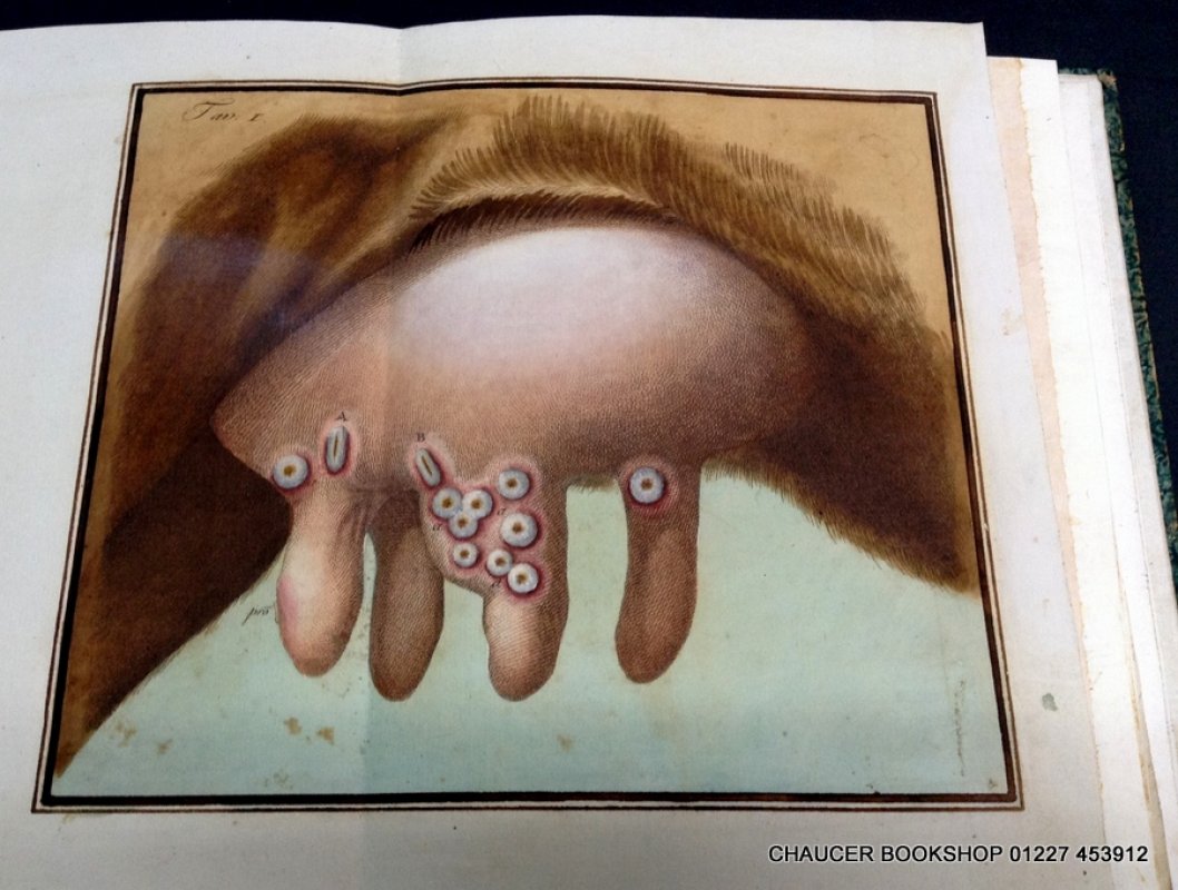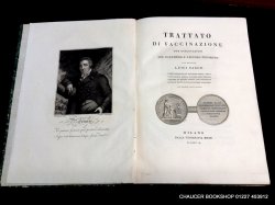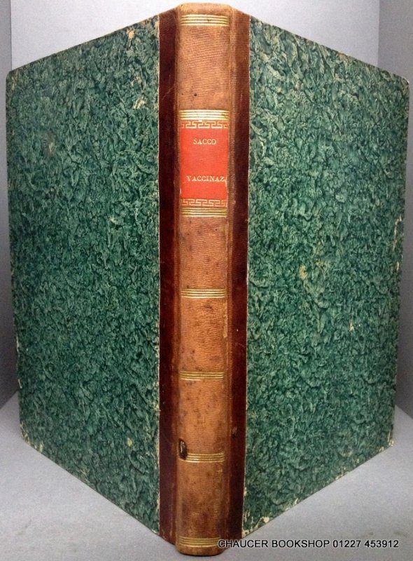 FIRST EDITION Large 4to. original half calf with red title label, gilt to spine and marbled paper-covered boards. TEXT IN ITALIAN. 221pp. + 2pp plus 4 large folding hand-coloured engravings at end. Also illustrated with an engraved frontispiece of Dr. Jenner and a portrait medal of Sacco. A clean copy with no previous owners' markings or inscriptions. Occasional very light foxing and slight darkening to endpapers. Small burn hole through leather layer of spine and some light wear and rubbing to marbled boards. Overall a VERY GOOD COPY.