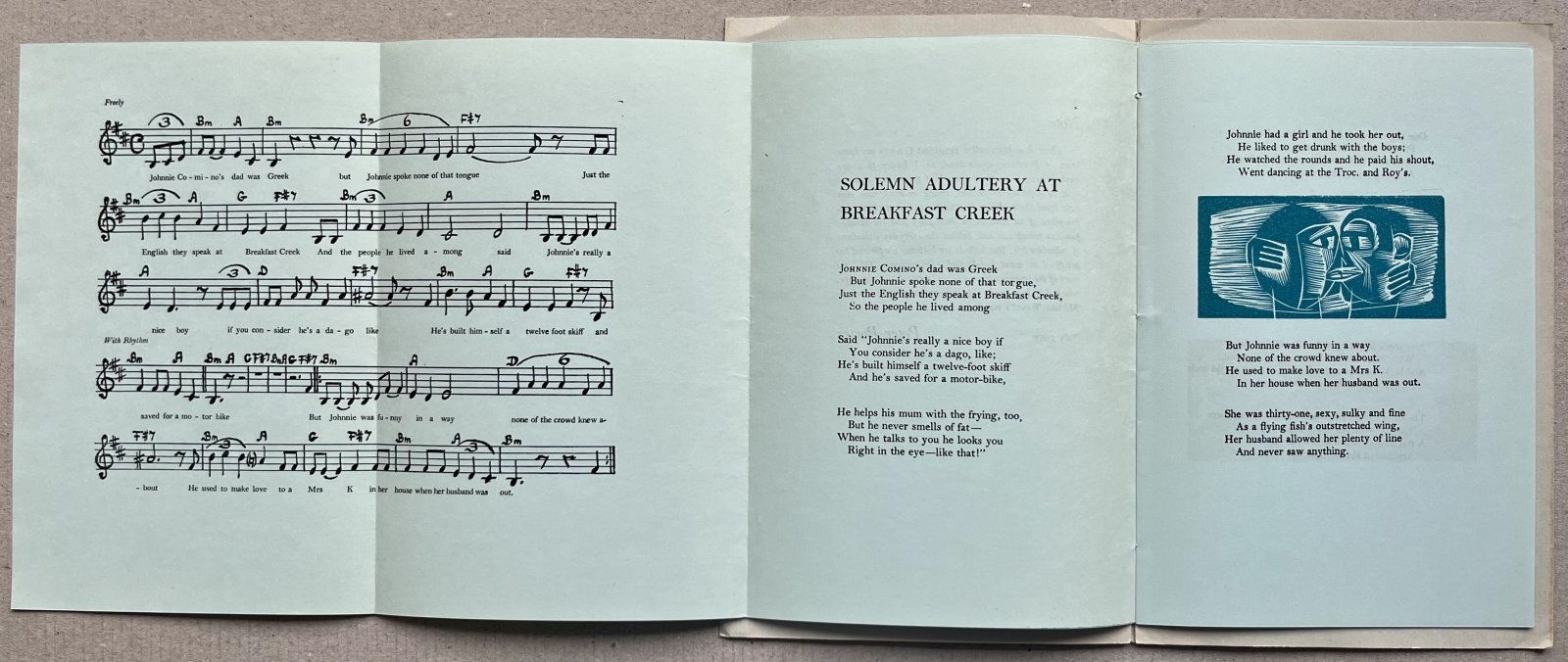 SOLEMN ADULTERY AT BREAKFAST CREEK: An Australian Ballad (Signed, Limited Edition) Set to music by Michael Jessett with guitar accompaniment and embellished with three linocuts by Paul Peter Piech
