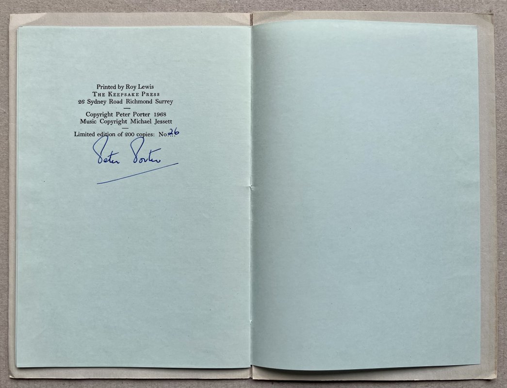 SIGNED, LIMITED EDITION, No. 26 of 200 copies. Stitched softback (approx. 22 x 14.5cm) with French fold paper wraps with linocut title to front cover. Text on pale blue stock, pages unnumbered, illustrated with three turquoise linocuts and with a gatefold score of the accompanying music. Signed and numbered by the Author in blue ink to Limitation page at end. No other markings or inscriptions. Slight show-through from linocut illustrations. Faint crease to top outer corner of front cover, else a VERY GOOD COPY.