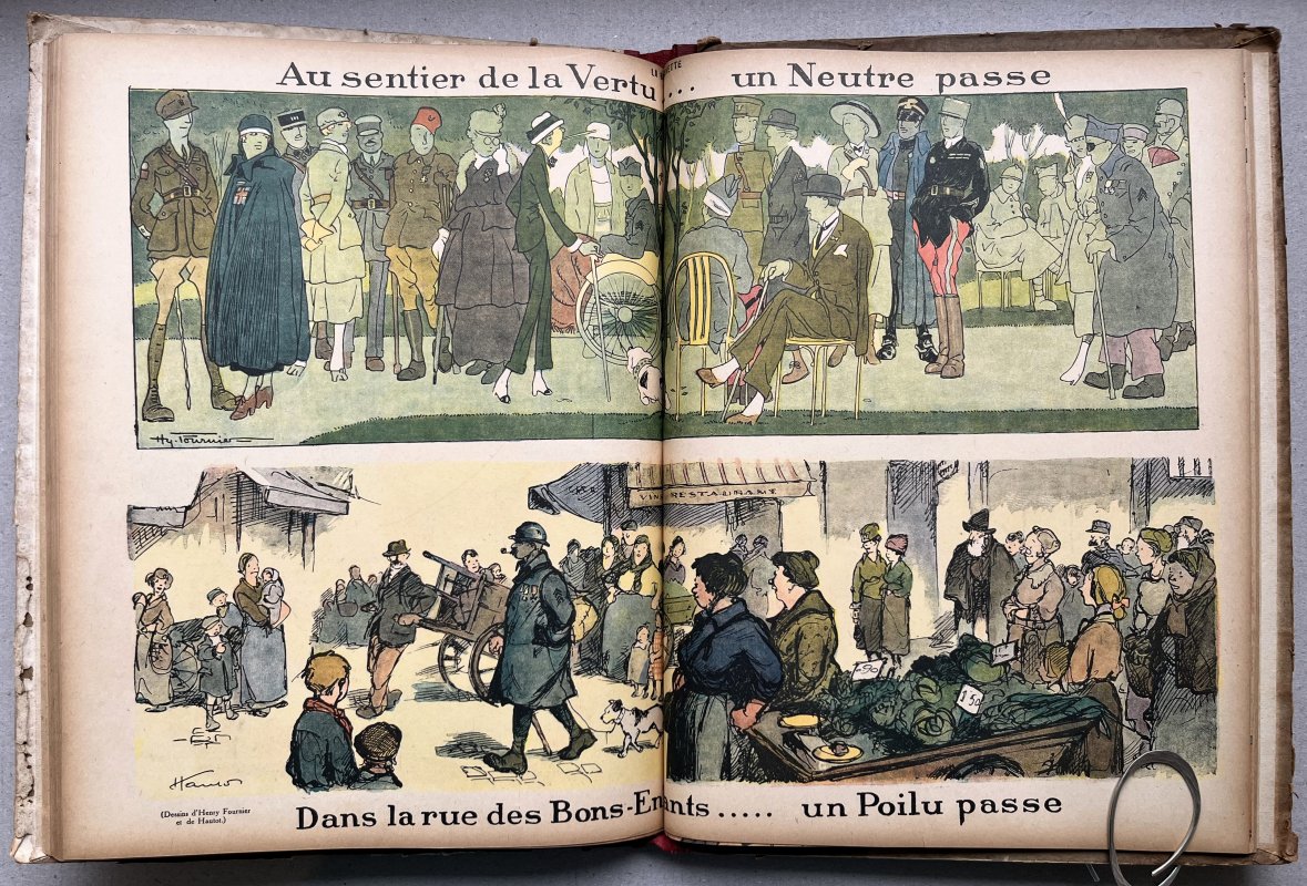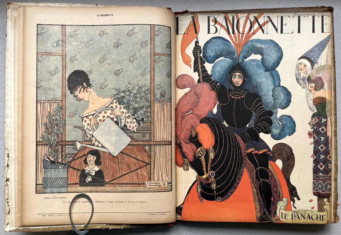 FIRST EDITION Folio hardback in quarter red buckram with illustrated paper-covered boards. TEXT IN FRENCH. Contains 13 concurrent issues, each of 16pp., profusely illustrated in colour and b/w by artists such as Poulbot, Capy, Barbier, Sylvain Sauvage, H. Fournier, Gus Bofa, Gerda Wegener etc. Text by writers such as Apollinaire, Mac Orlan, Leo Larguier, La Bouquetiere and Boots etc. Small ink signature and date to ffep. Slight browning to page edges. Rubbing and wear to edges of pastedowns. Damp staining to upper board from red cloth (please see photo) and some light soiling and edgewear to boards. Overall a Good+ Copy.