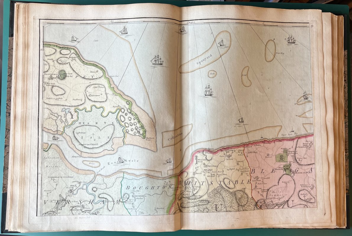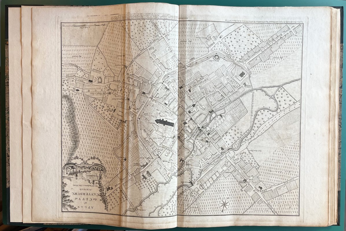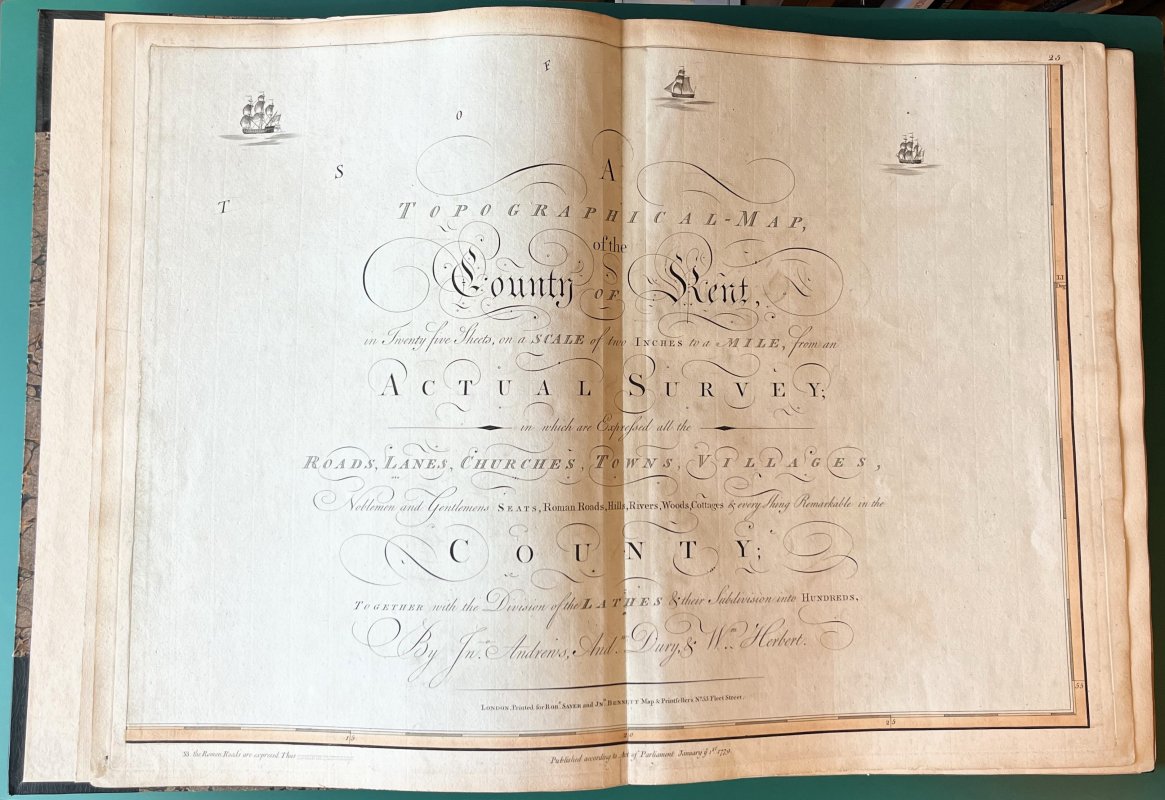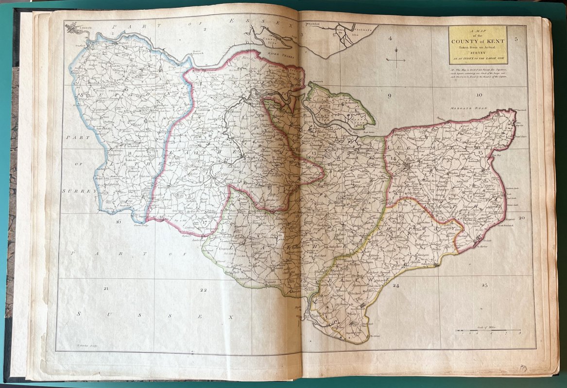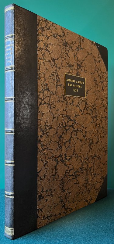 1779 Edition with the extra uncoloured Plan of Canterbury. Folio (approx. 54.5 x 41cm) hardback rebound in half black morocco with raised bands, gilt, to spine and marbled boards with matching black morocco title label, gilt, to upper board. New endpapers. Each map approx. 53.5 x 73.5cm. Contains Title page (Plate 25) with hand-coloured border, Dedication (Plate 21) with hand-coloured border, Map of the County of Kent with outline hand-colouring (no Plate number), 23 fully hand-coloured plates with each Hundred in different colour wash, and an additional uncoloured Plan of Canterbury (no Plate number). Previous bookseller's pencil notes to ffep, else a clean copy with no previous owners' markings or inscriptions. One map with slight crease to centre fold. A couple of other maps with slightly ragged edges, not affecting the image. Tiny chip to marbled paper of upper board and a few tiny white specks to lower morocco corner (please see photos), otherwise a REMARKABLY CLEAN, BRIGHT COPY in VERY GOOD CONDITION.