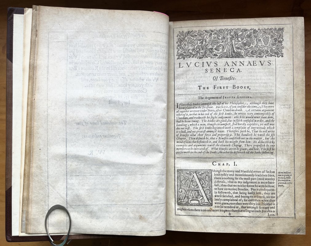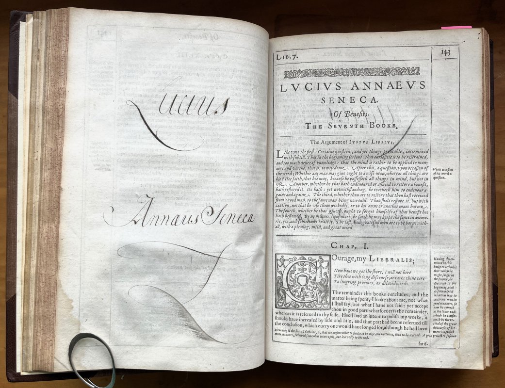 Small Folio (approx. 29.5 x 20cm) hardback in modern half brown morocco, raised bands, gilt to spine and brown cloth boards. All edges speckled red/brown. New endpapers. Lacking title page and earlier part of The Life, starting at 'd'. Introduction etc. unnumbered. Main text 921pp. plus unnumbered Table section at end. Decorative chapter heads and tailsand initial caps. Small page numbers to first and last sections hand-written in margins. Small signature to top of first page and large calligraphic rendering of Seneca's name to blank facing p.143. A few pages at front and rear have had edges professionally reinforced. Occasional light foxing, handling marks and small ink splashes. Slight rubbing to spine and corner edges. A GOOD+ COPY.