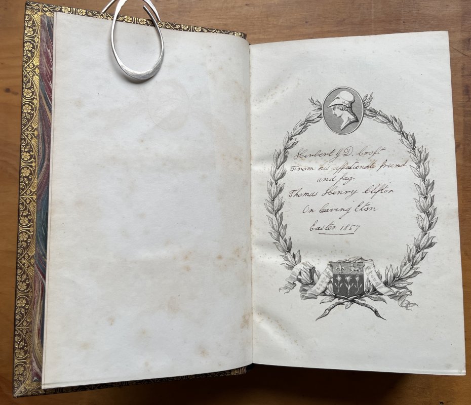 Two Volumes, 8vo., in full calf gilt, with raised bands and gilt decoration to spine, all edges gilt, and marbled endpapers; Vol I: 630pp; Vol II: 840pp, indexed. Neat ink gift inscription dated 1857 to early blank within an engraved device that includes the Eton College motto. Both Vols. have foxing to endpapers and to the first and last few pages; boards have a few small marks and rubbing to edges and spines. Overall a VG set.