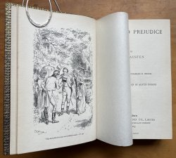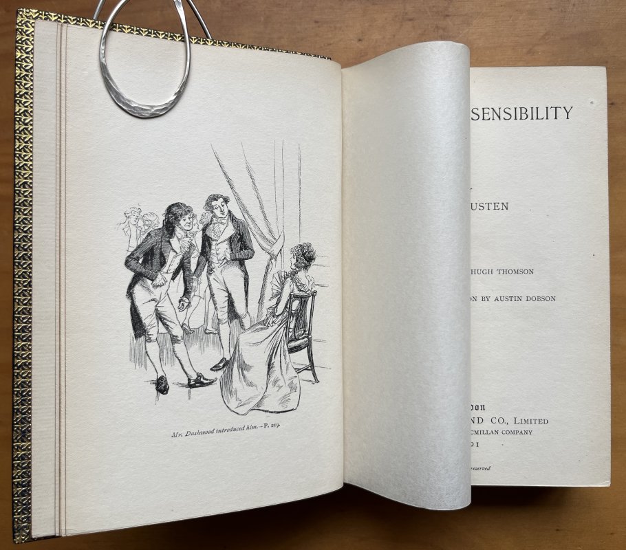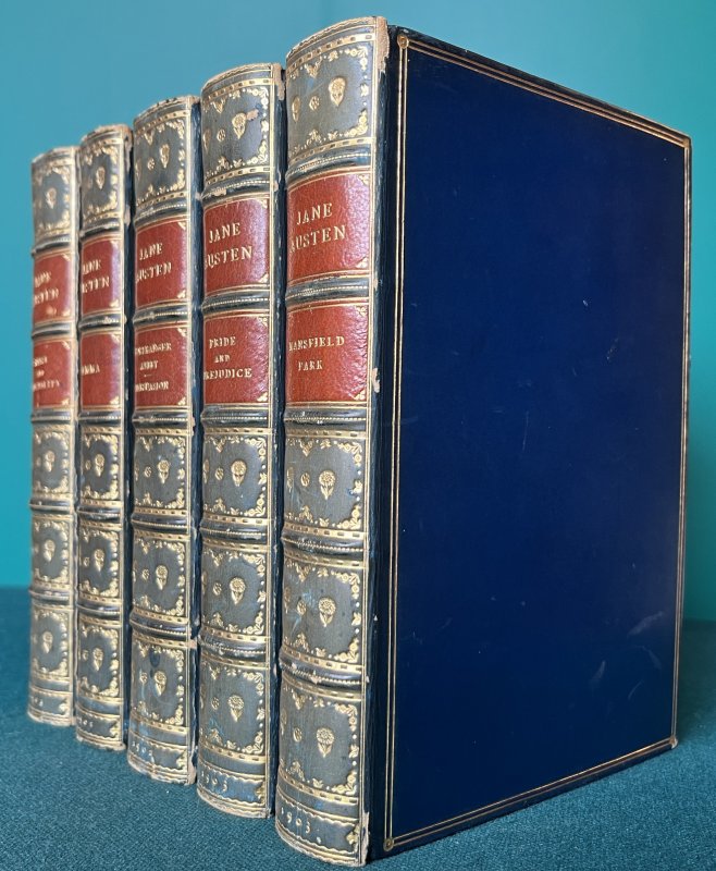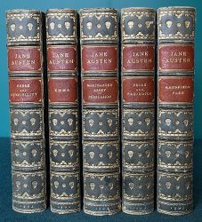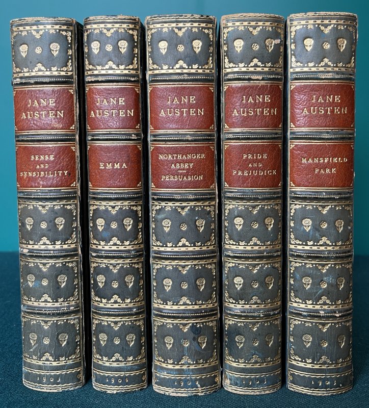 6 Novels bound in 5 Volumes. 8vo. full blue calf with raised bands, 2 chestnut brown morocco title labels, decorative gilt. Gilt dentelles and decorative endpapers. a.e.g. Bound by Bumpus of Oxford. Sense and Sensibility, Emma, Northanger Abbey & Persuasion, and Mansfield Park all illustrated in b/w by Hugh Thomson. Pride and Prejudice illustrated in b/w by Charles E. Brock. All frontispieces tissue-guarded. Each volume with armorial bookplate to verso of ffep (with slight offsetting to facing blank). Internally clean and bright throughout. Blue calf of spines slightly and uniformly faded. Slight rubbing to spine edges. A few faint spots of soiling and scuffs to boards but overall a VERY GOOD, HANDSOME SET.