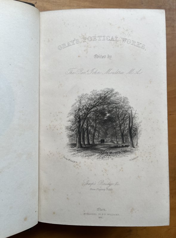 Fifth Edition 8vo. hardback in full dark blue calf with raised bands, dark red title label, decorative gilt to spine and gilt vignettes of Eton College Chapel to upper board and Gray's Eton Memorial to lower board. Endpapers and all edges marbled. vi, [2], c, [2], 142pp. Tissue-guarded portrait frontispiece plus 14 b/w engravings and wood-cuts. Ink presentation inscription from one Eton student to another, dated 1857, to early blank. Occasional light foxing, mainly to prelims. Some light scuffing and rubbing to boards and spine edges. A GOOD+ HANDSOME COPY.