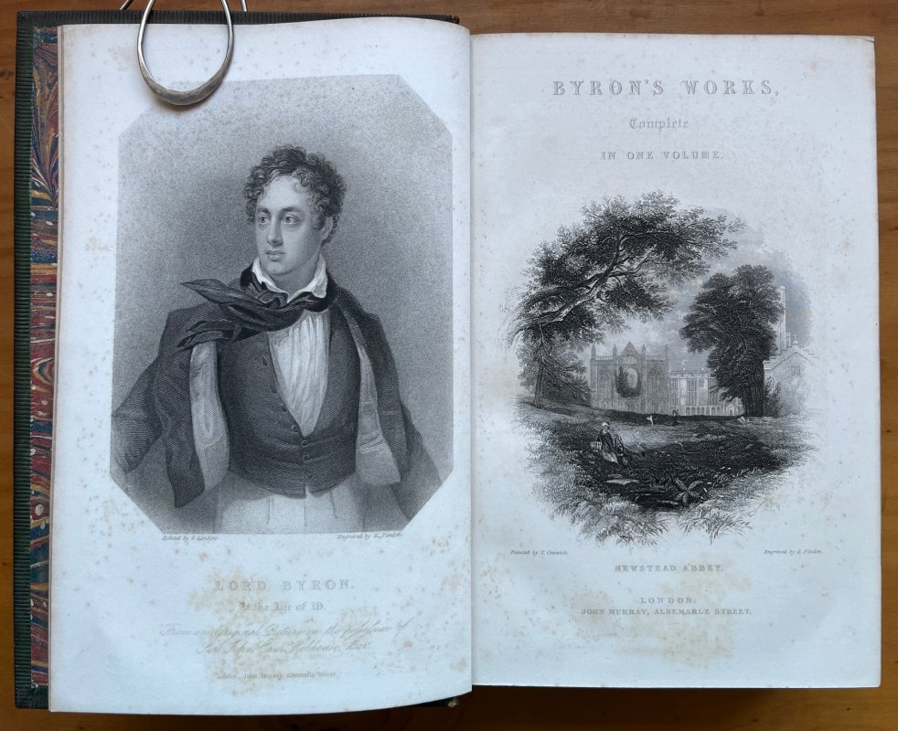 Copyright Edition. Large 8vo., in full green calf gilt, with raised bands and gilt decoration to spine, all edges marbled plus marbled endpapers; [viii] + 4 plates of facsimiles of Byron's handwriting +827pp, indexed, with engraved portrait frontis plus vignette to title page. Ink gift inscription dated 1857 to early blank. Foxing to endpapers, and to the first and last few pages, a few small marks to boards, edges a little rubbed. A Good+ copy overall.