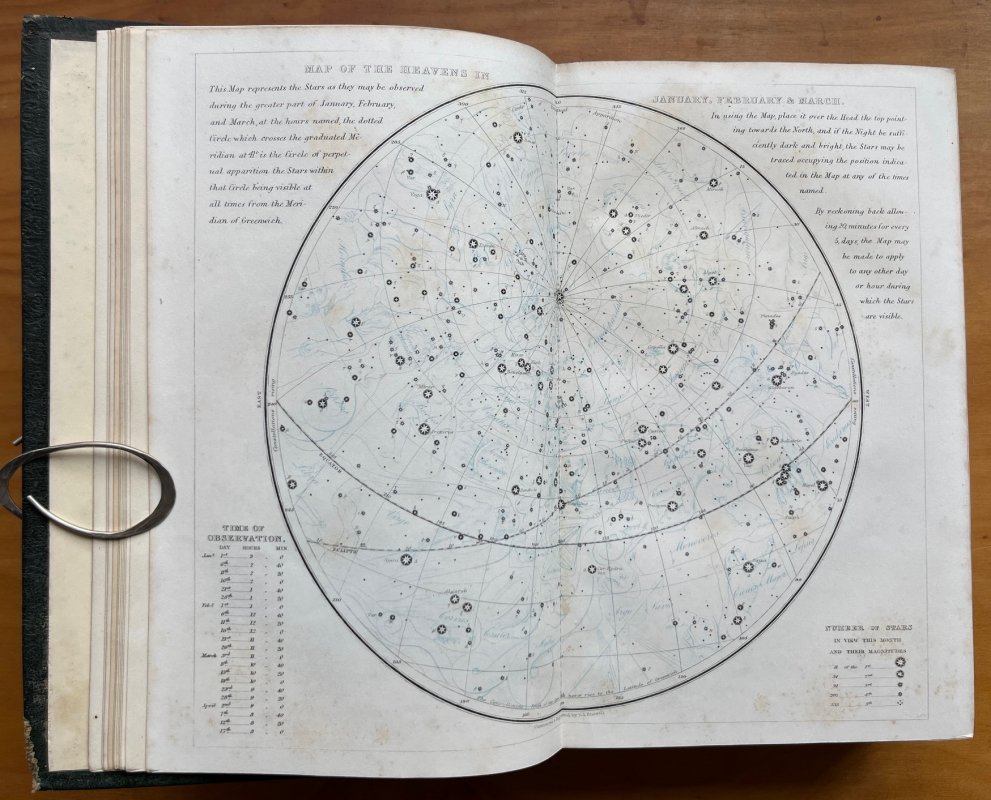 A New Edition, Carefully Revised. Large 8vo., in full green morocco gilt, with raised bands and gilt decoration to spine, decorative gilt borders to both boards, a.e.g. [xii] + 803pp, indexed, with engraved frontis plus vignette to title page, many other engravings on wood and steel, including 8 double-page plates of the Heavens, moon and sun, 4 of which are in duo-tone, plus numerous engravings within text. Ink gift inscription dated 1857 to early blank. Foxing to endpapers, first and last few pages, plates, plus some occasional foxing and browning throughout; a few small marks to boards, edges rather rubbed. A Good copy overall.
