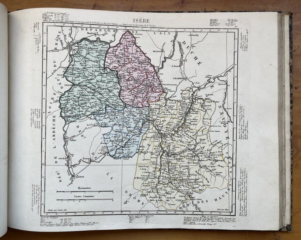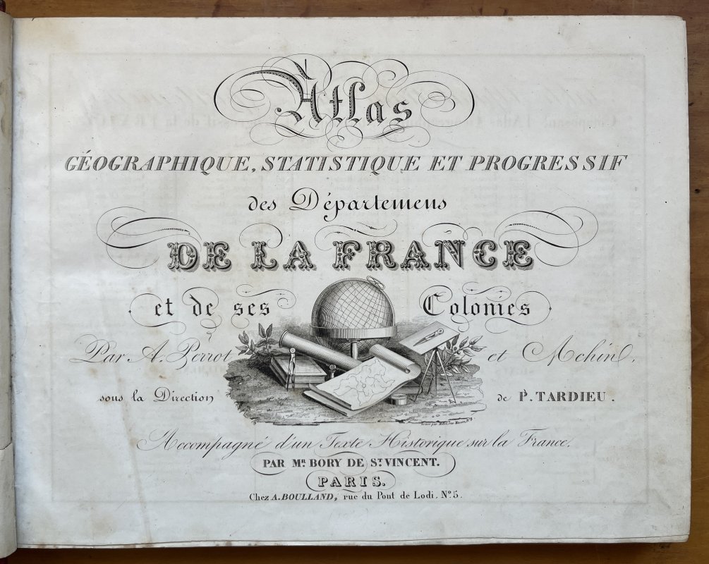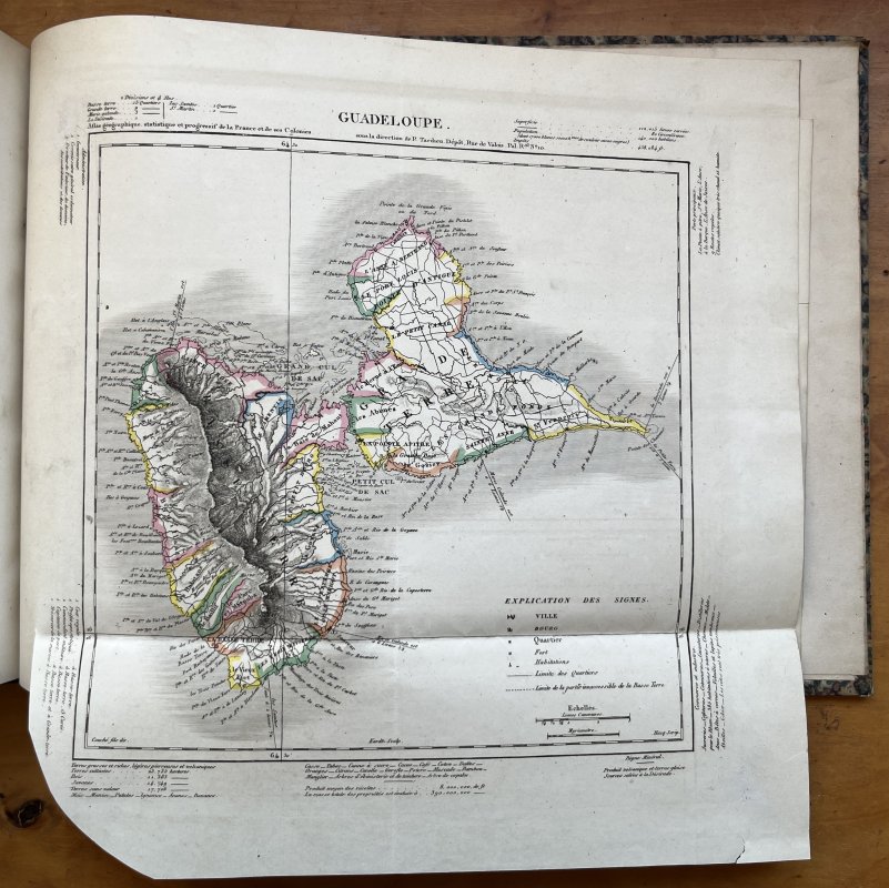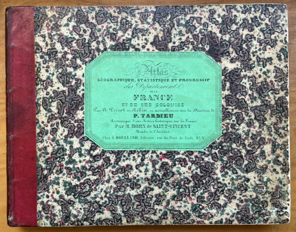 Landscape 4to. (approx. 27.5 x 35cm) hardback in quarter red morocco, decorative gilt to spine, marbled boards and green paper title label to upper board, in marbled slipcase. TEXT IN FRENCH. 12pp. Text followed by large folding Table, 88 hand-tinted maps of the Departments and Paris (35 of which are also duplicated in b/w), 7 large folding hand-tinted maps of the French Colonies and 2 large folding hand-tinted maps of France and les Douanes. A few tiny ink numbers and faint pencil marks to list of Maps at front. No other markings or inscriptions. Occasional light foxing. Small closed tear to ffep repaired with white paper strip. Slight crease to title page. Light soiling and edgewear to red morocco spine and slight rubbing to marbled boards. Edges of marbled slipcase rubbed with small split to one lower edge. Overall a VERY GOOD COPY in GOOD+ SLIPCASE.