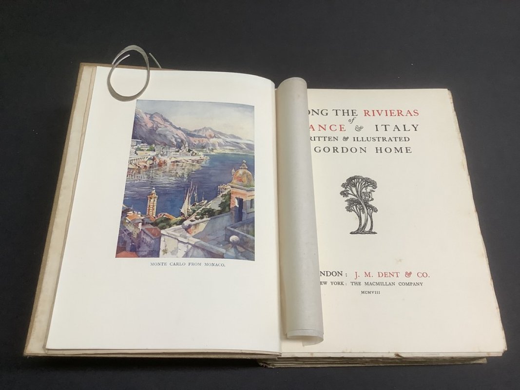 FIRST EDITION Large 8vo. (approx. 23 x 16cm) beige cloth hardback with decorative gilt, red, pale blue and green titles to spine and upper board. 328pp., Indexed, illustrated with 25 colour plates and 25 b/w line drawings, plus a b/w folding map of the Rivieras at the end. A clean copy with no previous owners' markings or inscriptions. Occasional light foxing, mainly to untrimmed foredge. Slight fading of gilt to spine and very slight soiling to covers. Overall a VERY GOOD COPY.