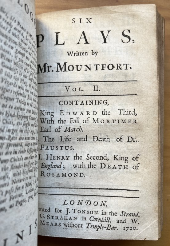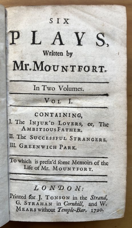 Six plays, written by Mr. Mountfort (2 Volumes bound in 1) Volume I: The Injur'd Lovers; The Successful Strangers; and Greenwich Park to which is prefix'd some Memoirs of the Life of Mr. Mountfort. Volume II: King Edward the Third, with the Fall of Mortimer, Earl of March; The Life and Death of Dr. Faustus; and H