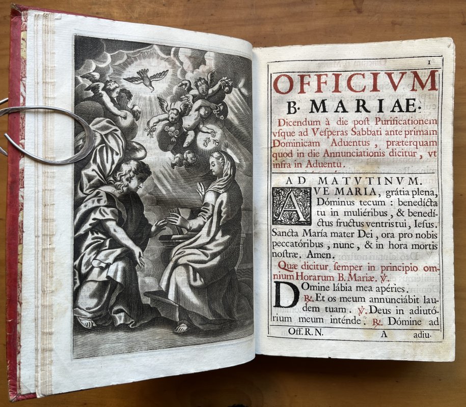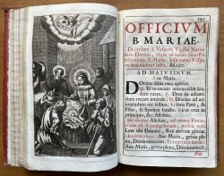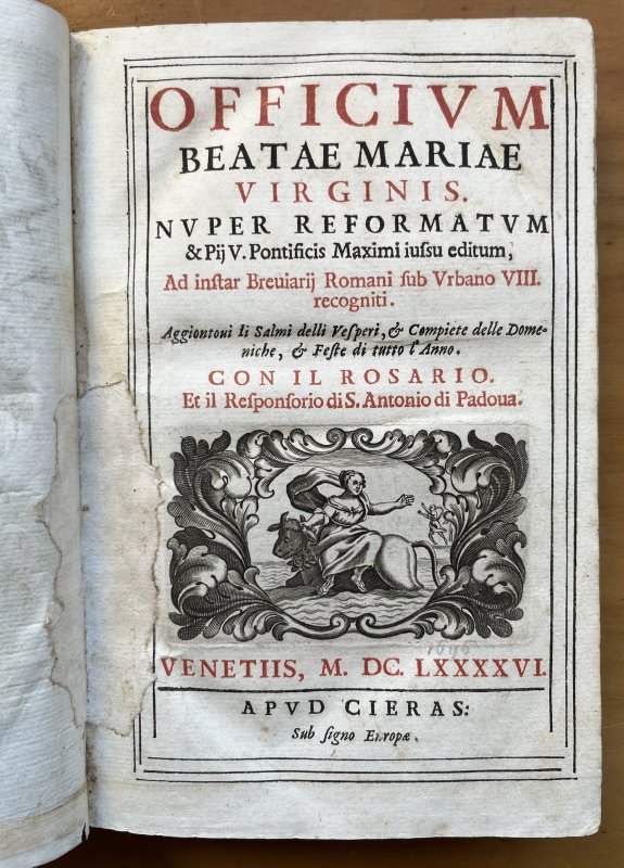OFFICIUM BEATAE MARIAE VIRGINIS. Nuper Reformatum & Pij V. Pontificis Maximi iussu editum,ad instar Breuiarij Romani sub Urbano VIII recogniti. Aggiontoui li Salmi delli Vesperi, & Compiete delle Domeniche, & Feste di tutto l'Anno.Con il Rosario. Et il Responsorio de S. Antonio di Padoua.