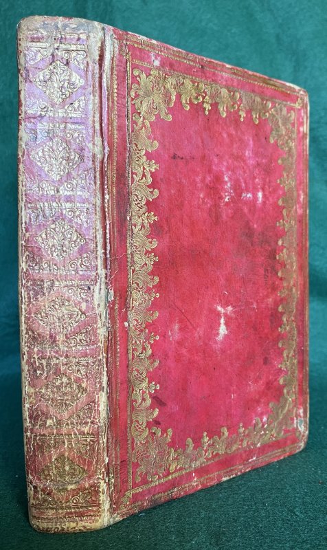 8vo. hardback in contemporary red calf with highly decorative gilt to spine and boards. Appears to have been rebacked a long time ago and free endpapers replaced. All edges gilt with blind-stamped decoration. Front and rear pastedowns with contemporary hand-stamped patterned paper. [24], 519pp., [1]. TEXT IN LATIN. All text pages printed in black and red. Engraved vignette to title page, engraved frontispiece and 4 further full page engravings plus occasional decorated initial caps and tailpieces. Small modern bookplate to front pastedown. Old repair to gutter between frontispiece and title page with corresponding staining to next few pages. Lower edge of frontispiece has also been reinforced (please see photos). Occasional light foxing and slight tanning to a few leaves but overall remarkably crisp and fresh internally. Spine and boards rather rubbed, soiled and worn, with slight damage to gilt decorative border of lower board, possibly when being rebacked. Internally a VERY GOOD COPY, externally a Good Sound Copy.