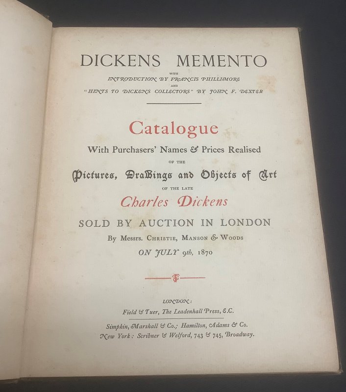 Dickens Memento. with Introduction by Francis Phillimore and "Hints to Dickens Collectors" by John F. Dexter. Catalogue with Purchasers' Names & Prices Realised of the Pictures, Drawings and Objects of Art of the Late Charles Dickens. Sold by Auction in L