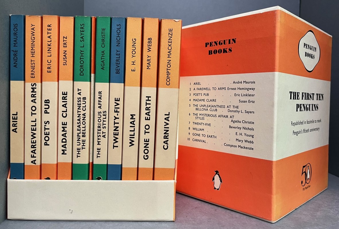 The First Ten Penguins. Republished in Facsimile to mark Penguin's Fiftieth Anniversary (10 Volumes in Slipcase) "Ariel", "A Farewell to Arms", "Poet's Pub", "Madame Claire", "The Unpleasantness at the Bellona Club", "The Mysterious Affair At Styles", "Twenty Five", "William", "Gone to Earth" and "Carnival".