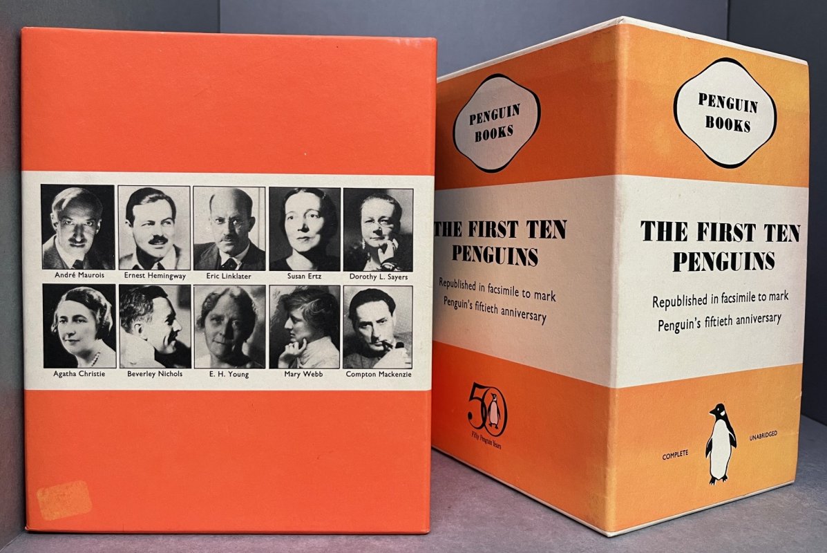 Facsimiles of the First 10 Penguin Books. 10 paperbacks plus slim folder housing a concertina-folded pamphlet featuring information about the 10 Authors. In a two-piece slipcase, the inner slipcase forming a display bookcase (please see photos). A clean set with no previous owners' markings or inscriptions. Slight fading to two sides of the outer slipcase and very slight soiling to base. Overall a VERY GOOD SET in VERY GOOD SLIPCASE.