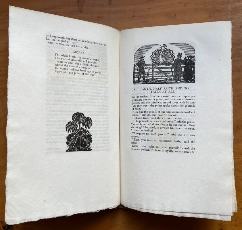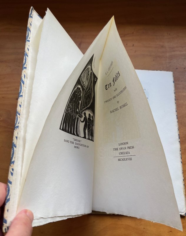 LIMITED EDITION No. 238 of 240 uncoloured copies Tall 8vo. hardback in quarter beige cloth, gilt and blue and cream patterned paper-covered boards, small cream paper title label to spine. Pages unnumbered. Illustrated with 21 wood cut illustrations by Rachel Russell. A clean copy with no previous owners' markings or inscriptions. Most leaves unopened. Slight tanning to endpapers. Slight browning to board edges and very slight soiling to cream cloth. Overall a GOOD+ COPY.