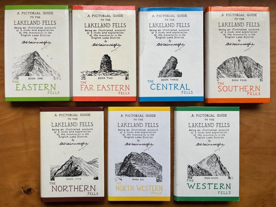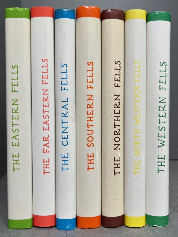 7 Volumes, complete. Small 8vo. dark green leatherette hardbacks in unclipped dust jackets. All volumes profusely illustrated in b/w. Book One: The Eastern Fells, reprint, nd. c.1993. Book Two: The Far Eastern Fells, reprint, nd. c.1990s. Book Three: The Central Fells, 95th Impression, nd. Book Four: The Southern Fells, reprint, nd. c.1990. Book Five: The Northern Fells, reprint, nd. c.1989. Book Six: The North Western Fells, reprint, nd. c.1989. Book Seven: The Western Fells, 79th Impression, nd. Neat purchase detail inscriptions, and/or signatures to front pastedowns or ffeps except Book Two which is blank. Book Three dust jacket lightly dampstained at spine and lightly soiled to flaps. Very slight fading to yellow bands and lettering of dust jacket spine of Book Six. Book Seven dust jacket has clear tape to front and rear flaps. Overall a REMARKABLY BRIGHT, VERY GOOD SET, in VERY GOOD DUST JACKETS.