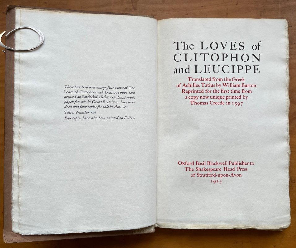 THE LOVES OF CLITOPHON AND LEUCIPPE Translated from the Greek of Achilles Tatius by William Burton. Reprinted for the first time from a copy now unique printed by Thmas Creede in 1597.