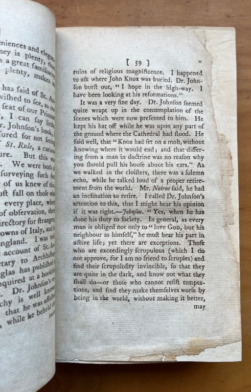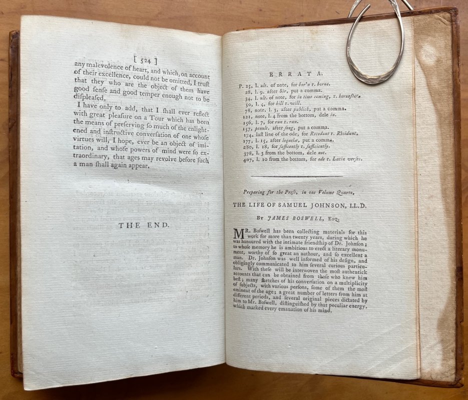 FIRST EDITION, a mixture of First and Second States ("in-induced" to p.121, "Kings and subjects" to p.237 lines 5-6, "nor Mrs. Thrale" to p.299 and with "Preparing for the Press, in one Volume Quarto" to Advertisement at end) 8vo. original calf boards, rebacked and recornered, with original spine laid on, dark green and dark red title labels, decorative gilt. Lacking half title but with Errata and Advertisement for the "Life" at the end. vii, 524pp. Small modern bookplate to foot of front pastedown. Occasional light foxing, heavier to prelims. Edges of p.59 professionally repaired. Small area of lower corner of p.203 missing. A few spots of soiling to original boards and some rubbing to original spine (please see photos). A VERY GOOD COPY.