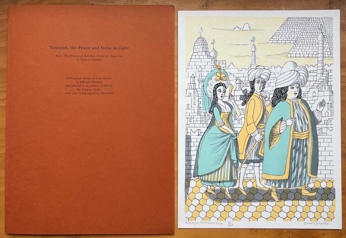 DE LUXE LIMITED EDITION No. 80 of 200 Copies, WITH SIGNED LITHOGRAPH. 4to. hardback in quarter black morocco, gilt, with patterned paper-covered boards, in burnt orange slipcase, with separate matching burnt orange folder containing original, signed lithograph. Book: t.e.g. 197pp., profusely illustrated in colour and b/w. Hand-written number to Limitations page. No other markings or inscriptions. Orange folder contains original 4 colour lithograph of 'Nekayah, the Prince and Imlac in Cairo' (from The History of Rasselas, Prince of Abyssinia by Samuel Johnson), printed in an edition of 200 (this being number 80) by the Curwen Studio and signed and numbered by the Artist. Gilt titles to morocco spine rather rubbed (please see photos), otherwise a VERY GOOD COPY with VERY GOOD LITHOGRAPH and FOLDER, in VERY GOOD SLIPCASE.