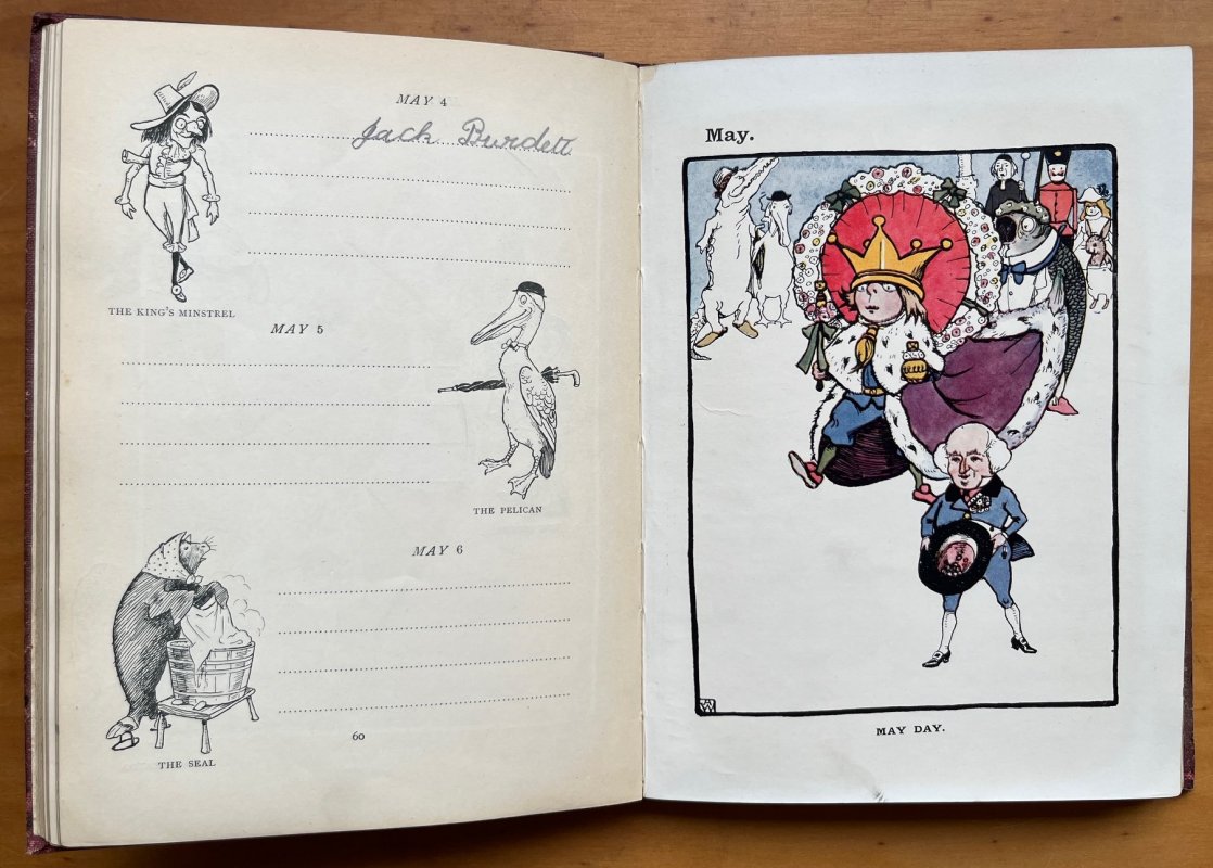 FIRST EDITION, SIGNED COPY. 8vo. maroon cloth hardback, decorative gilt to spine and upper board. a.e.g. 143pp. plus 17pp. blanks with Memoranda headings. Profusely illustrated with 12 colour plates and numerous b/w line drawings for each date. Signed by the Author under the date of his birthday p.43. Ink signature and date (1906) and a blind-stamped ownership impression to ffep. A few ink and pencil names added to various dates. Occasional light foxing, heavier to prelims. A few small spots of soiling t covers and light wear to top and base of spine. A VERY GOOD COPY.