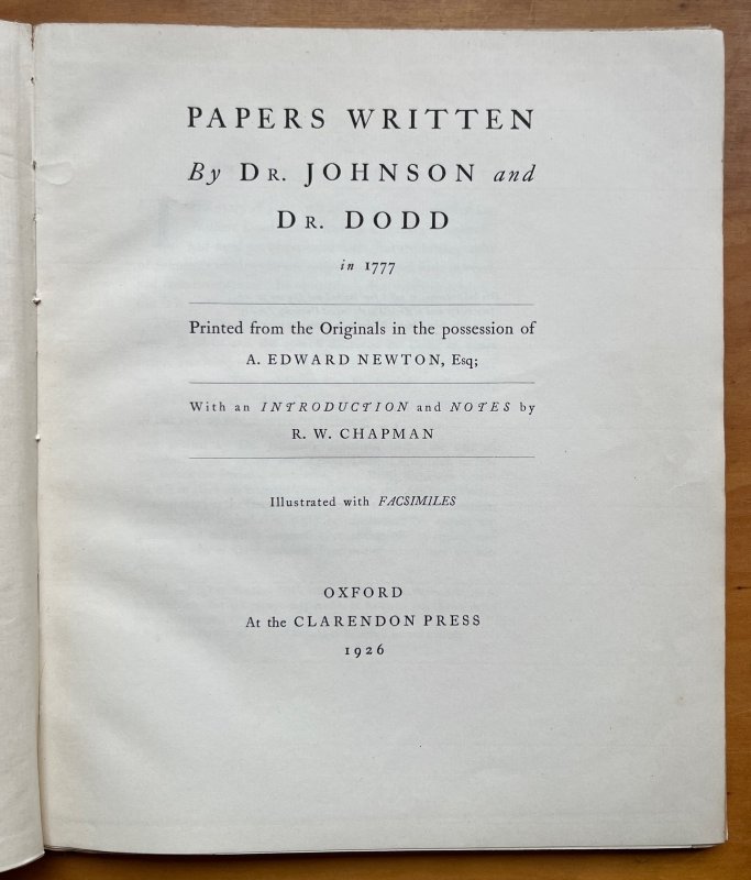 PAPERS WRITTEN BY DR. JOHNSON AND DR. DODD IN 1777 Printed from the Originals in the possession of A. Edward Newton, Esq. With an Introduction and Notes by R. W. Chapman. Illustrated with Facsimiles.