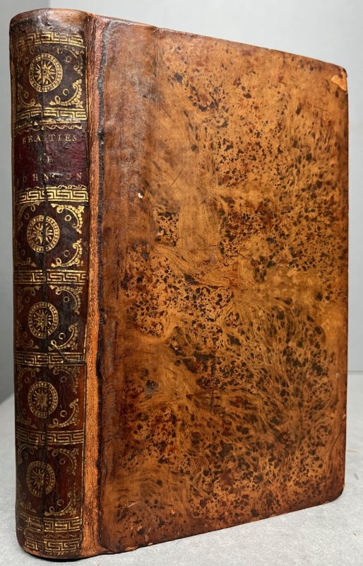 A New Edition, being the SEVENTH, wherein the Two Volumes are comprised in One, and arranged under one alphabet, with considerable additions. Small 8vo. hardback in original mottled brown calf, rebacked with remains of original spine laid on, red title label, decorative gilt. lxxx, 2pp. Advertisements, 294pp. Text plus 6pp. Catalogue at end. With engraved portrait frontispiece (dated 1786) and engraved facsimile of Doctor Johnson's handwriting. Ink inscription, dated 1852, to prelim. Offsetting from portrait frontispiece to title page. Some faint water-staining to top and lower edges of pages. 2 Pages torn with no loss of text. Vertical crack and some rubbing to original laid on spine (please see photos). A VERY GOOD, HANDSOME COPY.