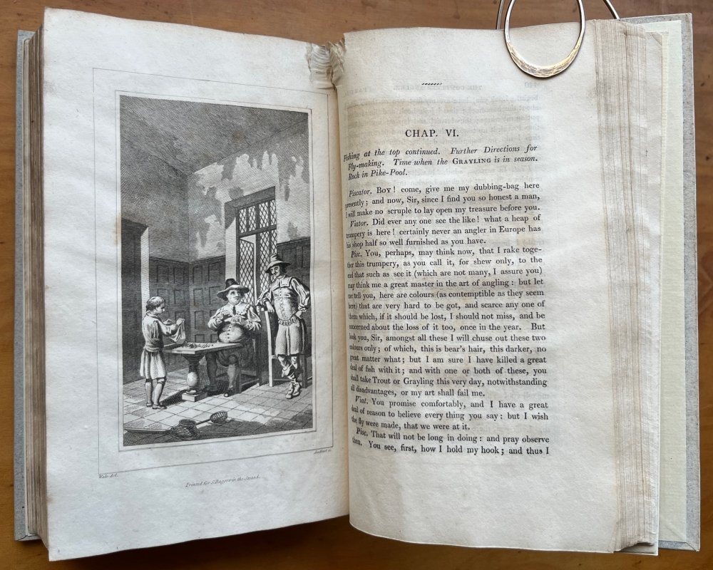 'Bagster's Second Edition, Being the Eighth of this Work: With Improvements and Additions'. 8vo., in a modern rebinding of grey paper-covered boards with paper title label to spine and new endpapers; [8] + pp11 - pp64 Life of Walton + [8] Epistle Dedicatory + pp81 - pp390 The Complete Angler Part I + [8] + pp401 - pp514 The Complete Angler Part II + 20pp Index. Engraved half-title, portrait frontis plates of Izaak Walton and Charles Cotton plus 48 other engravings. Previous owner's small name plate to front pastedown, faint ink mark to Part I title page slightly offset to frontis plate. Edges a little dusty, area of damage to top edge with short closed tears in the top margins of pp415 through to pp507, very occasional light foxing and faint handling marks. A Good+ copy overall.