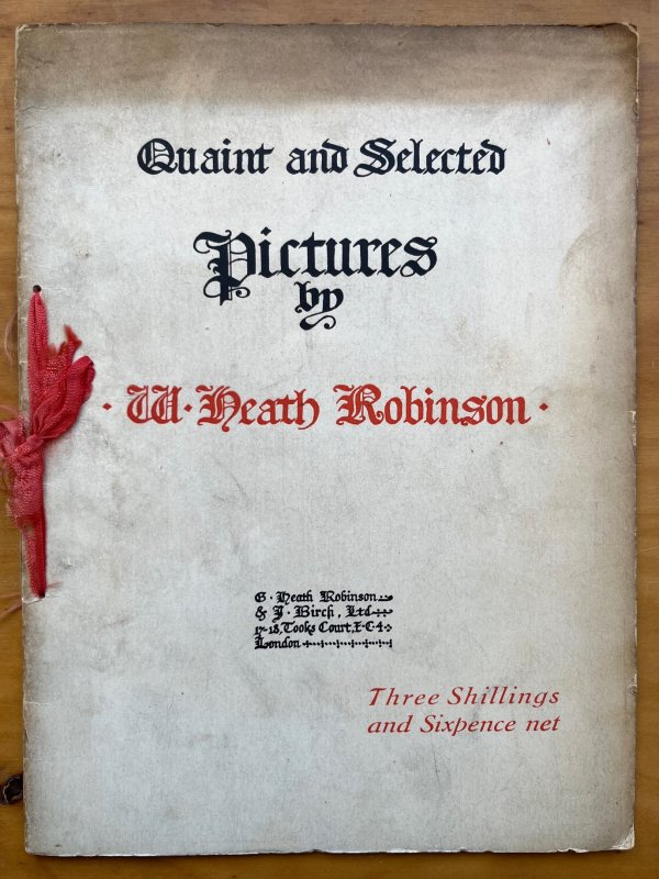 FIRST EDITION Softback (approx. 31.5 x 23.5cm) with card covers secured with red ribbon. Pages unnumbered. Featuring 13 humorous monochrome illustrations (printed one side only) by W. Heath Robinson. A clean copy with no previous owners' markings or inscriptions. Card covers rather soiled and with 3cm tanned strip across top of front cover. Red ribbon ties rather frayed. A Good Copy of a very scarce title.