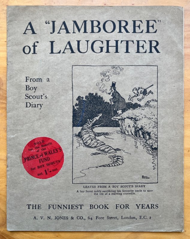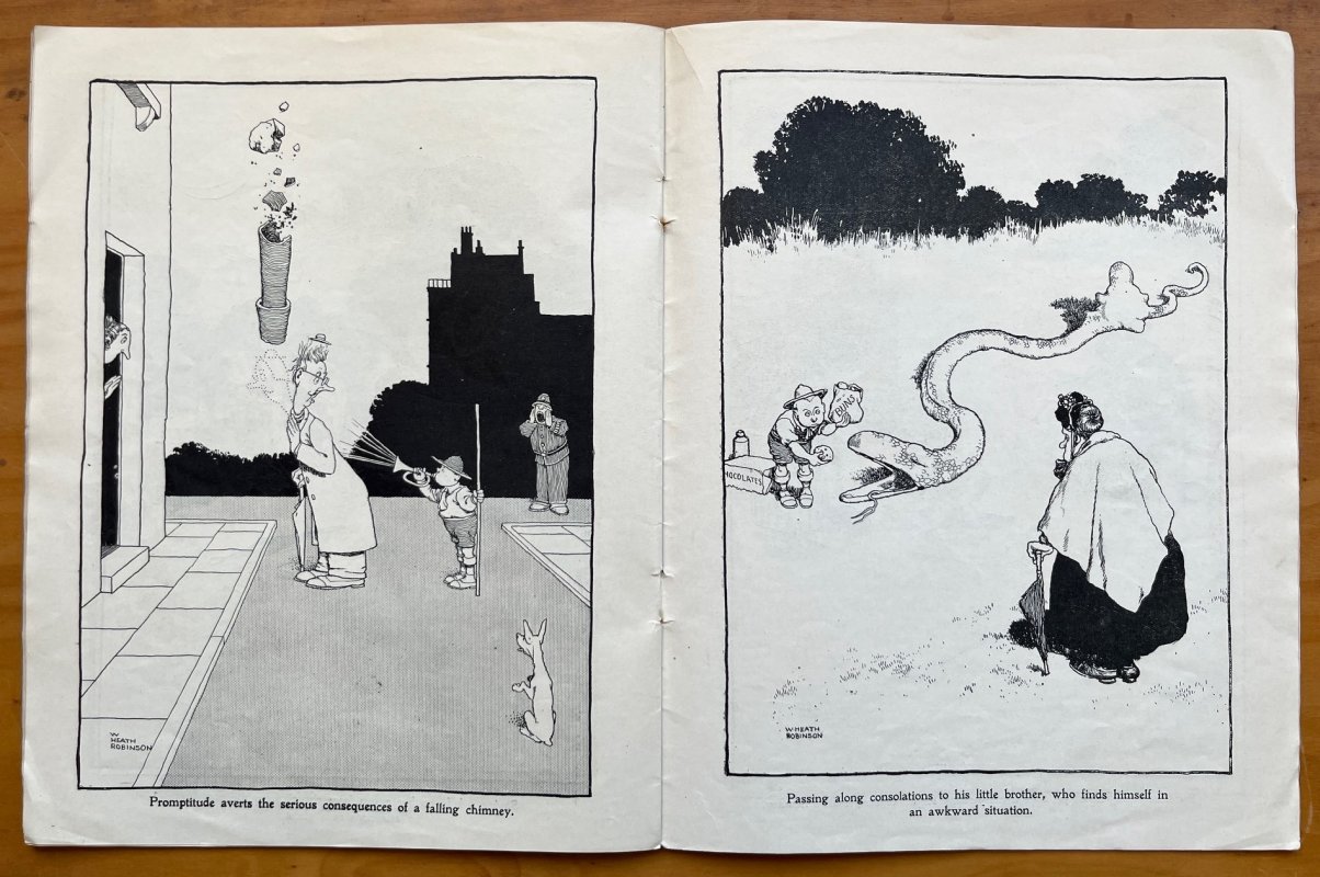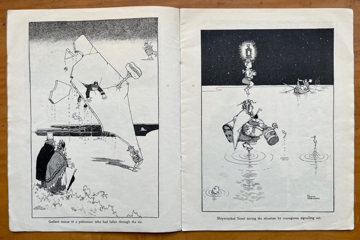 FIRST EDITION Stapled softback (approx. 27.5 x 21.5cm) with illustrated card covers. Pages unnumbered. Features 20 full-page line drawings by W. Heath Robinson plus 2pp. Advertisments. A clean copy with no previous owners' markings or inscriptions. Circular red sticker 'Sold for the Benefit of the Prince of Wales's Fund for Boy Scouts' to front cover. Very slight edgewear to covers, else a VERY GOOD COPY.