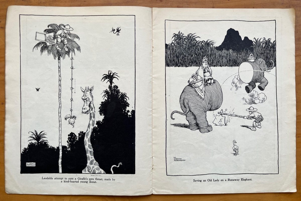 FIRST EDITION Stapled softback (approx. 27.5 x 21.5cm) with illustrated card covers. Pages unnumbered. Features 20 full-page line drawings by W. Heath Robinson plus 2pp. Advertisments. A clean copy with no previous owners' markings or inscriptions. Covers somewhat darkened with light soiling and edgewear. A Good+ Copy.