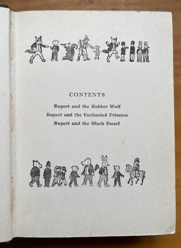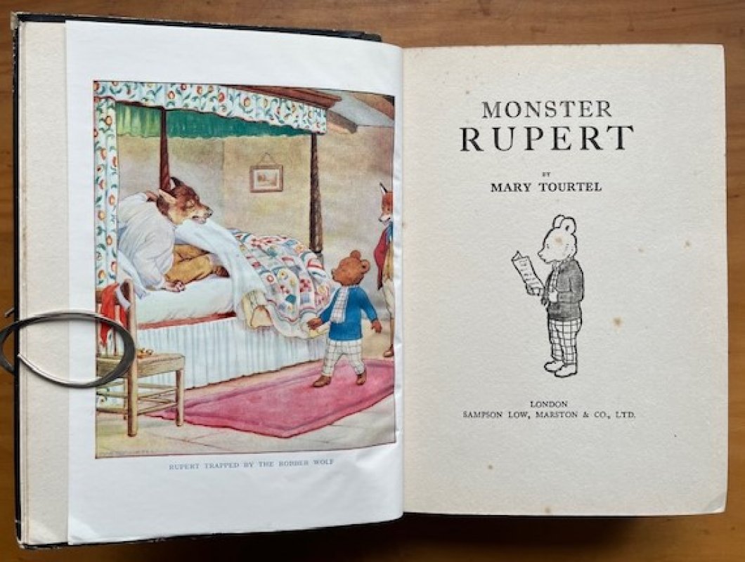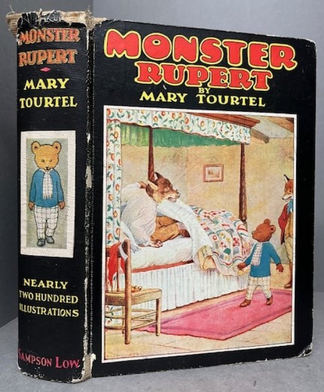 FIRST THUS and First in the Moster Rupert series. Large 8vo. hardback with illustrated black paper-covered boards. No endpapers, as issued. Pages unnumbered. Features 3 previously unpublished stories, with colour frontispiece and nearly 200 illustrations, one to each text page. A clean copy with no markings or inscriptions. Heavy foxing to prelims, light foxing to top and foredge. Cover edges rubbed with chips to paper-covering and damage to top of spine (please see photos). A GOOD, SOUND COPY.