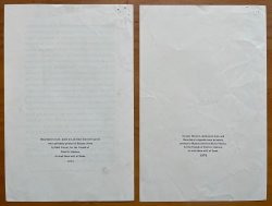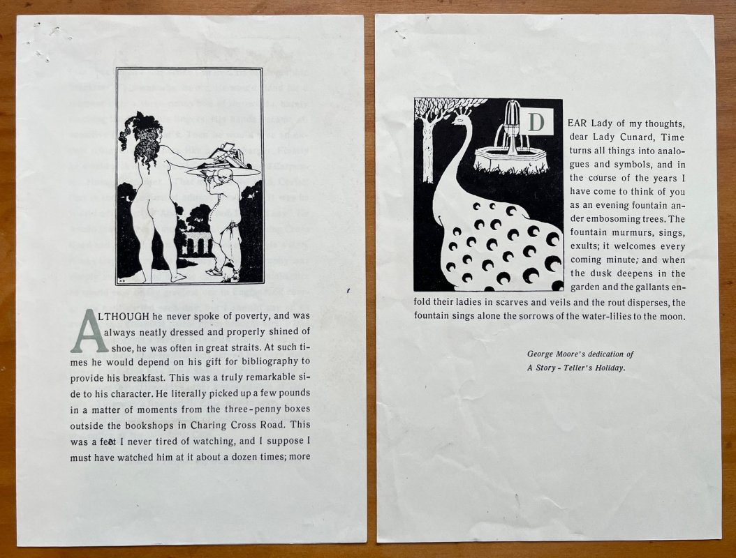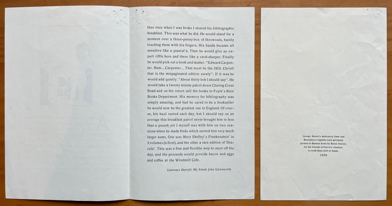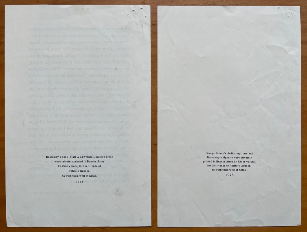 2 4pp. Keepsakes (approx. 20 x 13cm) privately printed in Buenos Aires by Raul Veroni for the friends of Patricio Gannon to wish them well at Xmas. The first features Lawrence Durrell's 'My Friend John Gawsworth' with Beardley's book-plate to front cover. The second features George Moore's dedication of 'A Story-Teller's Holiday' with a vignette illustration of a peacock, also by Beardsley.. Very slight soiling and a few tiny staple holes in top left hand corner (please see photo). A Good+ Set.